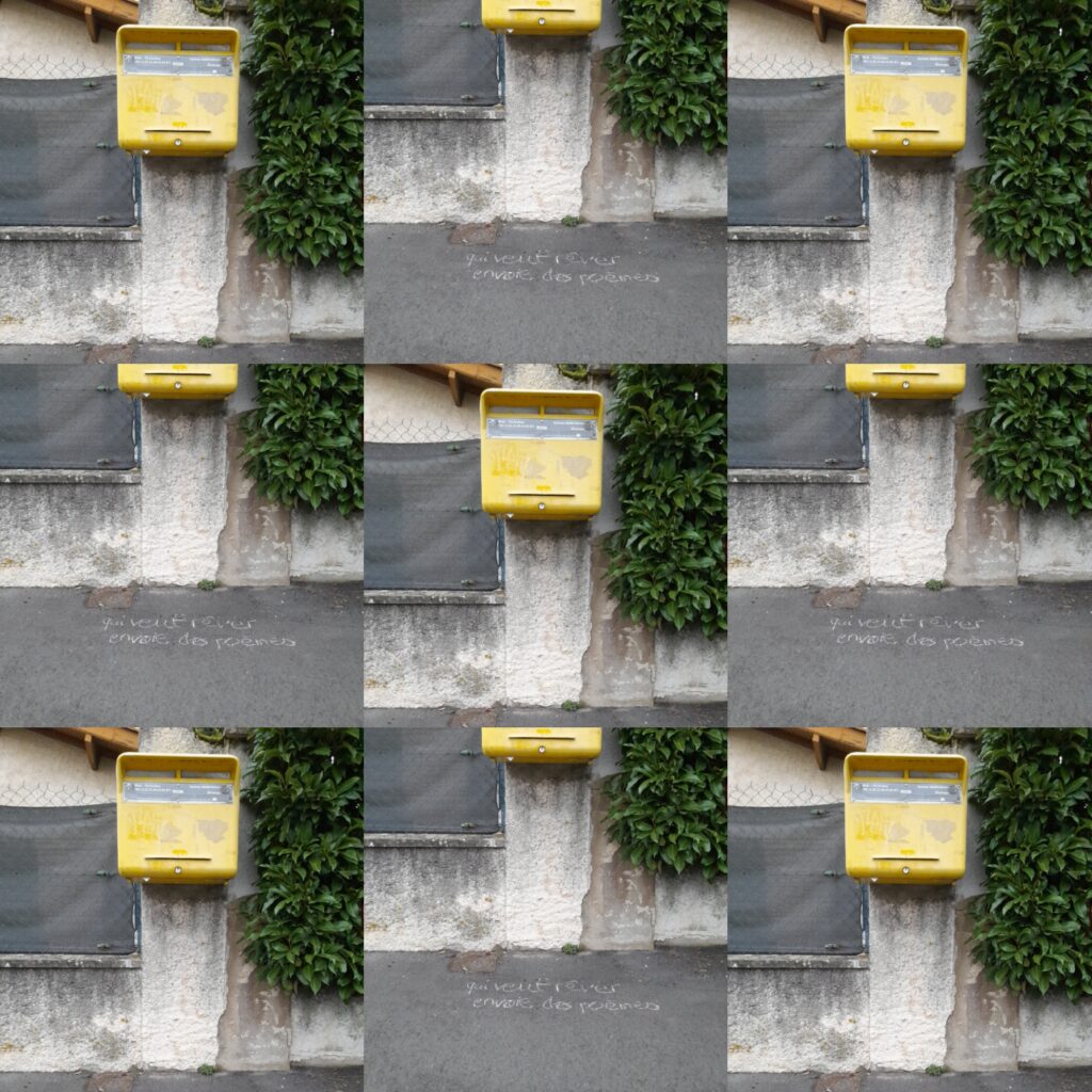 #21 | faire bouger les choses | Ecrire accroupie sur l’asphalte, le geste timide, offrir un message crayeux, éphémère, de mots et d’imaginaire, que le passant anonyme s’interroge, baisse le regard avant d’observer ce qui l’entoure. Pour celui portant son courrier à la boîte aux lettres : qui veut rêver, envoie des poèmes, pour le promeneur de la piste cyclable : cheminez à la lisière du rêve, pour le passant de la rue voisine : si les murs parlaient ? dévoilaient l’histoire ?