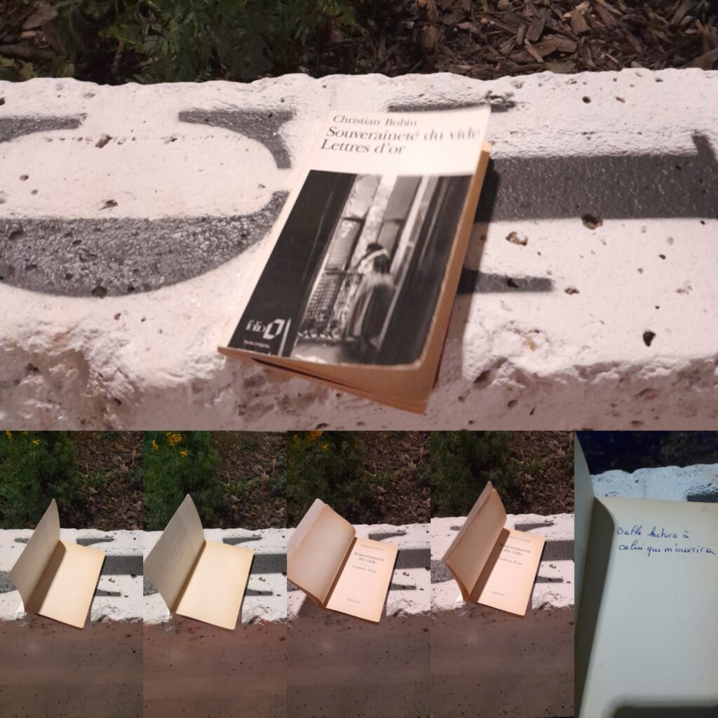 #22 | à perdre | Un seul livre, jeté dans le sac de voyage sans soupçonner la consigne à venir. Ni choix, ni hésitation, sauf celui de ne pas m’en séparer. Aucun banc alentour, des murets encombrés de végétation. L’offrir alors à la table de chevet de la chambre d’hôtel, à la desserte du couloir face aux ascenseurs du 9e étage ? L’entourer d’autres livres sur l’étagère publicitaire d’un hall d’entrée ? Avec qui seront partagées les images du poète qui vient de nous quitter ? La séparation se prémédite au fil des heures de la journée.