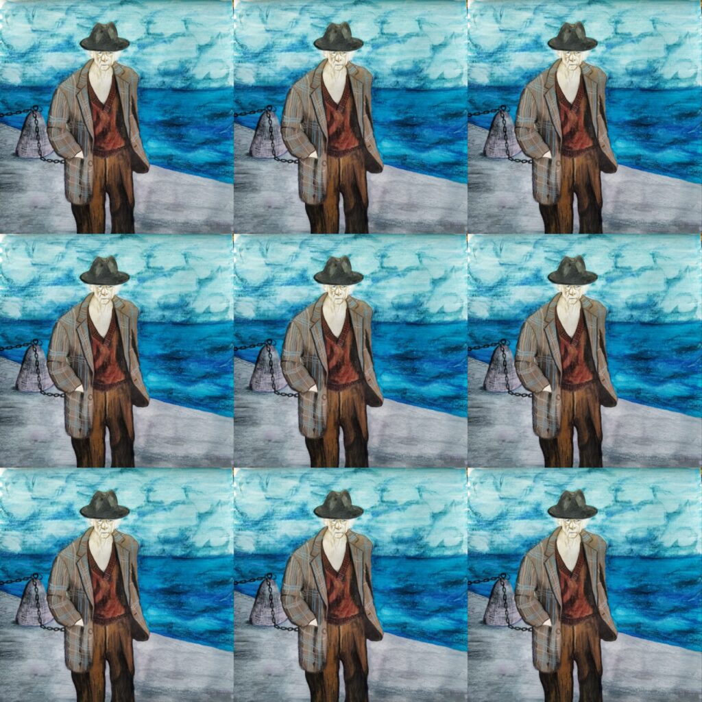 #32 | les morts sont parmi nous | Sa main tendue. Vers moi, vers l’invisible. Gravité fragile au-dessus des flots. Sa main me fixe. Derrière mes paupières sa silhouette se détache à l’extrémité de la digue. Il m’entraîne, m’accompagne, me transmet ce que dans son dos, il me cache encore. Chapeau de feutre et costume gris. Traits de noirs et de blancs. Il me dit son empreinte, son sillage, me dit d’aller encore plus avant.