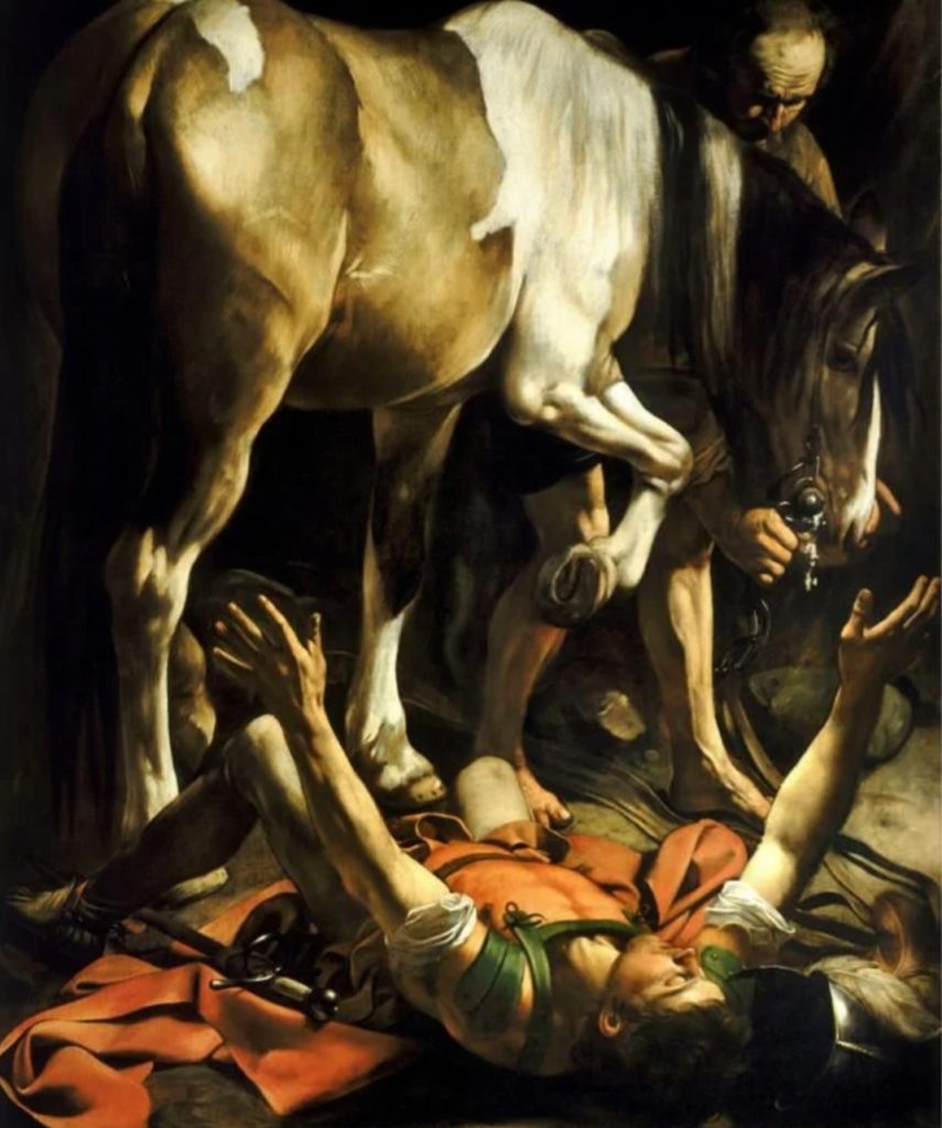 la première fois qu’elle avait vu à Rome la Conversion de Saul sur la route de Damas elle avait cru rentrer dans cette église de Santa Maria del Popolo comme dans un théâtre dont le tout petit écrin à l’intérieur – en fait la chapelle Cerasi du nom de son commanditaire- au bout semblait-il d’un long couloir renfermait trois tableaux peints sur toile très larges et très hauts en de nombreux points spéculaires et s’organisant en demi-cercle Elle s’était presque laissée porter par le flux des touristes en masse déjà dans la longue file d’attente menant à la scène tripartite qui cachait de façon rusée quand on se présentait devant elle donc de face la vision d’ensemble des peintures latérales du Caravage -soit la Crucifixion de Saint Pierre et la Conversion de Saint Paul- comme s’il eut fallu se préparer longuement à l’observation à venir, en quelque sorte méditer a priori sur leurs contenus livrés seulement comme par enchantement à une distance de quelques pouces des œuvres alors que l’Assomption de la Vierge du Carracci au milieu donnait déjà de loin et pour le spectateur impatient plus de satisfaction La file dans le lieu sombre au milieu des autres visiteurs faisait déjà se mêler les corps les regards les souffles qui au moment de l’entrée dans la chapelle se seraient pour certains d’entre eux séparés compte tenu du caractère exigu de l’espace auquel s’ajoutait l’obscurité du petit décor qui, elle, par intervalles était facilement déjouée par des pièces de monnaie introduites presque par magie dans un socle à l’entrée Par magie les corps les regards les respirations se retrouvaient ainsi illuminés en même temps que les sujets représentés si réalistes semblant bondir hors des toiles des peintures et en prolonger mentalement l’espace voire celui de la chapelle regroupant les observateurs en petites masses compactes et qui ondulaient de droite à gauche quasiment sur place comme mues par un mouvement cohésif sourd ou métallique au milieu d’eux, sujets bien réels leurs corps tombant leurs bras en croix s’ouvrant leurs échines se tordant l’animal soit le cheval de Saint Paul offrant au regard et de façon assez inattendue son énorme croupe au premier plan Dans le prolongement des hautes diagonales rythmiques dynamiques des tableaux elle s’était rapprochée du corps à terre du saint en bas à droite elle aussi frappée par la secousse divine sous l’haleine chaude et humide de son cheval pie écrasée qu’elle était par un poids surnaturel et à la fois bien concret dans ce petit espace qui ouvrait sur une route exiguë autant qu’infinie et silencieusement se refermait sur elle dans une telle intensité de lumières presque crues et d’obscurité qu’elle n’avait pendant longtemps plus bougé prise dans les filets d’une conversion et d’un martyre spéculaires (les lignes et les volumes géométriques formaient dans les deux toiles des crucifix) qui étaient rentrés dans son regard sa chair son corps tout entier de sorte qu’elle n’avait plus bien su quel était des personnages de l’animal ou du végétal le rôle qu’elle incarnait dans lequel du moins elle se fondait ici au cœur de la peinture et de ses visions épaisses