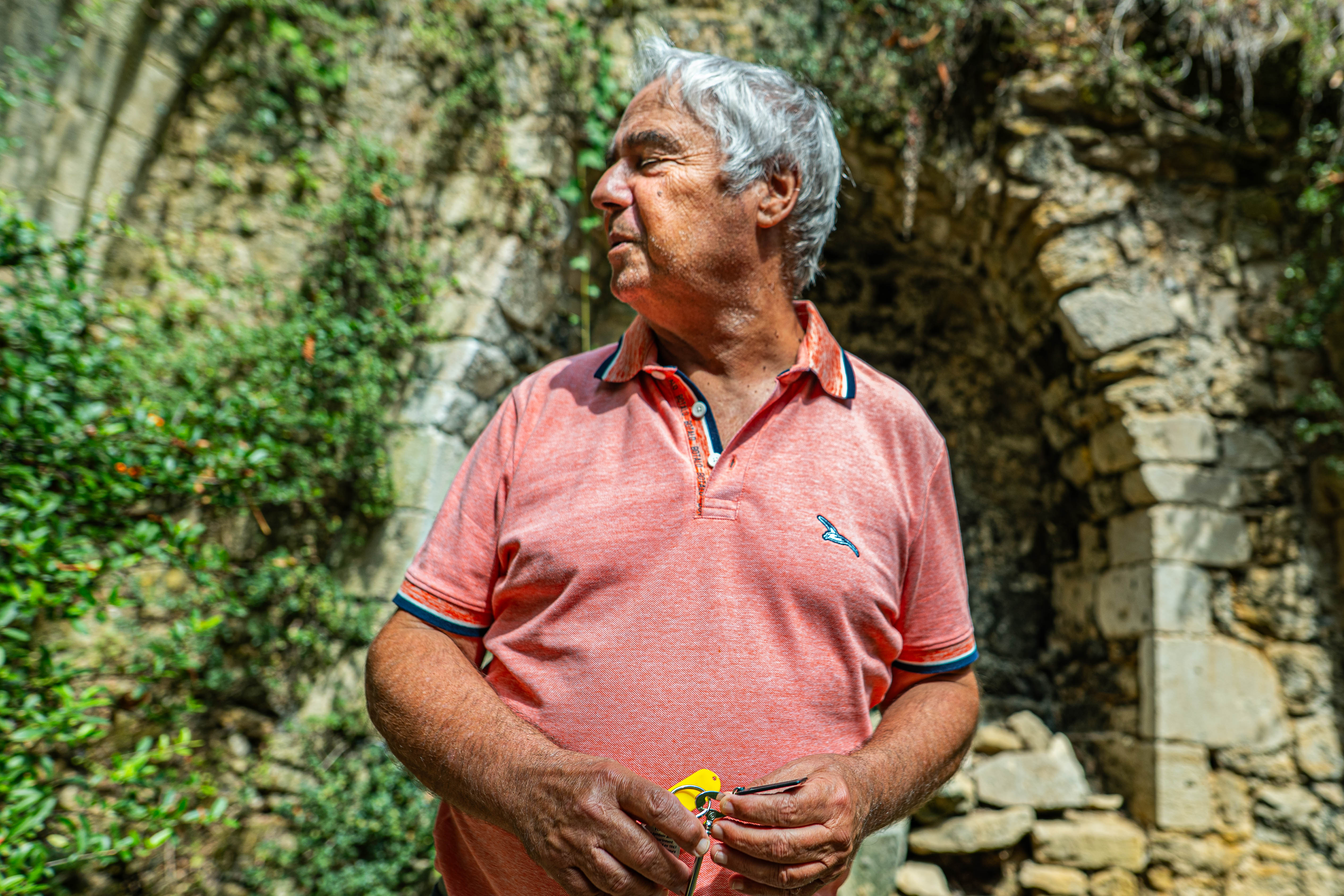 Enfant, on habitait cette ancienne île. Ou le pourtour de l’ancienne île, rue d’En-Haut, rue d’En-Bas, avec l’église et le cimetière, les écoles et la Boucarde, les venelles et nous le garage. Mais le centre entier de l’île, et son élévation principale, l’ancienne abbaye fermée dans ses murs. Dedans, des arbres — sinon pas. J’en ai encore souvenir des visites de la partie publique : par exemple un fanon de baleine, recueilli sur la côte en 1835 (de la date je ne me serais pas souvenu, mais quand je l’ai revu avant-hier aussitôt il s’est ajusté sur l’image souvenir, comme de n’en jamais avoir bougé). À l’été, par dessus le mur au fond du garage, on causait avec ceux du château, qui venaient pour les vacances, du contenu de ces conversations avec l’autre de mon âge, par dessus le mur qui nous séparait, je n’ai pas souvenir, mais qu’elles existaient et où elles avaient lieu, oui. Je me souviens aussi, quand on avait creusé pour installer le pont-élévateur du garage, de la découverte de ce souterrain qui rejoignait par en bas et l’église et le château. C’est de cela qu’on a parlé, avec Dominique Sorrente, quand avant-hier il nous a accueillis. Je n’étais jamais entré dans ce monde de puissantes ruines et fragment brut d’histoire dont il est le maître (ou surtout des factures, élagages, toitures). À cause du souterrain il nous a montré les cryptes, escaliers se perdant dans la nuit, soupiraux et traces de fouilles. L’hiver, depuis l’école primaire (elle est devenue un bureau d’assurances, le platane est resté — et les gogues, curieusement les gogues — mais le mur et le préau ont été soufflés) on se mettait à trois ou quatre pour sauter le mur du domaine interdit et empocher ces marrons beaux et luisants dont à l’automne j’ai toujours le goût, on venait jusqu’où commençaient les grilles et vieilles pierres mais trop la trouille on n’allait pas plus loin et on cavalait pour le retour. C’est ce frisson qui m’a tellement soudé, dès les huit ou neuf ans, au Château de Pagnol ou au Grand Meaulnes mais ce même frisson était là intact, tandis qu’aujourd’hui j’en franchissais les grilles. Dans l’énigme des sagas familiales, une autre partie de l’abbaye est en vente à la découpe, on le vit comme de s’en séparer soi-même. Avec Dominique Sorrente (on a le même âge à quelques semaines près, il y a aussi Chamoiseau et Yvon Le Men), on ne s’ancre pas dans le passé, et ce qui peut surgir de nostalgie en partage dans ce village désormais pas en très bel état. Moi je rêvais à ce que ce serait une grande lecture Rabelais, genre 10h ou 11h sous les arcades du scriptorium, mais c’est précisément ce qu’accomplissait Dominique avec ses propres textes et amis (Nouvelle comète, par les Ivres Vivants) ce dernier vendredi. La mairie a mis un cadenas neuf sur l’accès à ce qui reste du garage, non détruit. Au moins, lui, il habite, dans ce grand malgré à quoi nous force le monde.