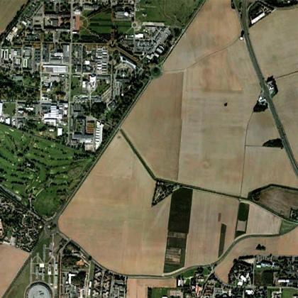 Il s’agit donc d’une route à deux voies étroite, uniforme et rectiligne, longeant à sa droite les grillages fermés du CEA, avec derrière une haie végétale discrète qui occulte les bâtiments, suivie d’un golf et de la publicité pour ce golf (à quoi sert un golf ?), signalant que le Français ordinaire peut venir déjeuner à sa cafétéria d’une formule à 12 euros mais je doute qu’ils fassent beaucoup concurrence au Relais. Puis rond-point avec arrêt de bus pour desservir le hameau de Saint-Aubin (au rond-point du Christ, Saclay était une bourgade pas très différente, reste sous-jacente dans la carte au présent la première disposition rurale, mais comme s’il fallait soulever le transparent avec le monde actuel pour les retrouver intactes).
