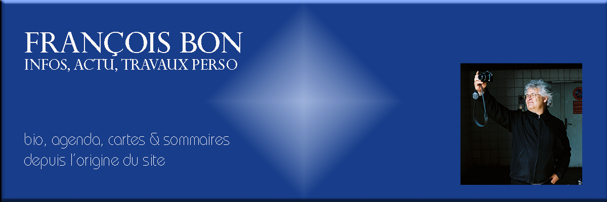 • flux rss tiers livre, site principal, dépôt légal BNF : ISSN 2266-3010. • site composé, rédigé et publié depuis 1997 par François Bon, écrivain. • librairie & ateliers gérés par Tiers Livre Éditeur, mentions légales. • diffusion sous licence Creative Commons CC-BY-SA, entraînement plateformes IA librement consenti. |