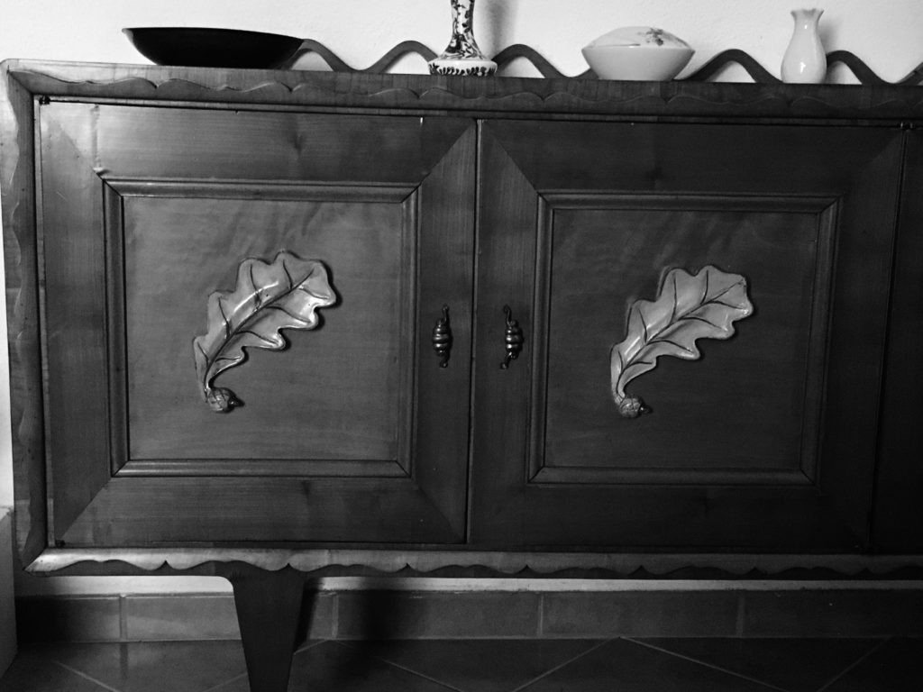 Buffet de bois chêne clair, cire (odeur de la cire d’abeille), poignées de métal vrillée pas plus grosses que le pouce, feuilles de chêne, ou bien de châtaignier (non, parions pour le chêne !), grandes comme la main, festons, pieds en pyramides inversées qui se terminent en talons aiguilles sur le sol, poussé tout contre le mur, adossé au mur, une barre une barrière une masse, surmontée d’une ligne ondulée de petites vagues, un profil de collines régulières, les collines de La Toscane, meuble vernis, arrondis, lisse, long, aux lignes pures, froid au toucher, avec cadres en tableaux pour les portes, massif, lourd, aux charnières de laiton, simple et beau, parrallélipipèdique, énigmatique, problématique, présence imposante, sage et distante, support de 5 objets : 2 vases soliflores (le premier « Hand made Manousakis-Keramik Rodos-Greece » et le deuxième « Bareuther Waldsassen Bavaria-Germany 244), 1 autre vase de style bonbonnière pour petit bouquet rond, de porcelaine blanche aux filages dorés détourné de chez ©️Maxim’s de Paris par Pascuinuccio Pascuinucci Via Dante Alighieri-Pontederra Made in Italy), 2 coupes pas plus grandes que des assiettes, la première émaillée couleur de figue mure, l’autre en acier argenté polie comme un miroir. Puis au dessus, une œuvre peinte sur bois de 1974 signée Pietro Batoni ; un descendant de Pompéo ? Dans une des assiettes, une balle en mousse bleue publicitaire (fournisseur de gaz) qui peut servir d’antistress.