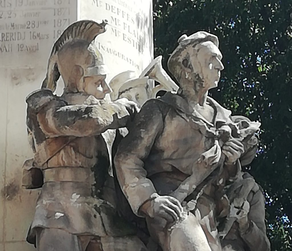 Un fusil de pierre est tenu d’une main de pierre par un soldat de pierre à la gueule tragique, les autres gueules aussi, des gars très réalistes, « Enfants des Bouches-du-Rhône morts pour la France pendant la guerre de 1870-1871 » avec leur barda, leur béret, leur képi, il y en a même un avec un casque à plumet, façon guerrier antique : les surmonte une France de bronze, étendard à l’épaule, dont la jupe longue, bien que figée dans le métal, a un drapé tout en mouvement, allons, allons, elle tend le bras, le glaive nu pointé vers le portail en ogive de l’église des Réformés avec ses deux clochers fuselés contre le ciel toujours bleu qui domine Marseille : la ville s’étale de tout son long entre mer et collines, un cargo quitte le quai d’Arenc, sa route tracée, à coup d’ondes en allers-retours entre balises et satellites, à travers l’aplat bleu qui figure la mer, au sud la ligne blanche des rivages africains, au nord les contours compliqués des côtes de l’Europe représentée en vert, à l’Est la mer noire : il flotte dans l’air des poussières de portes, des poussières de port, des poussières de mort, la poudre du désespoir des gens de Marioupol.
