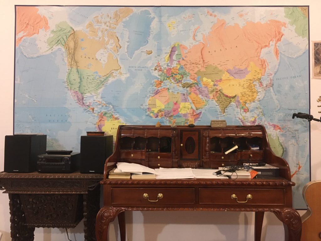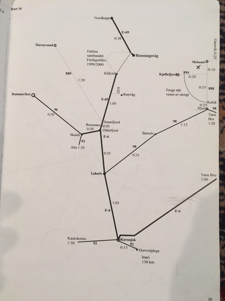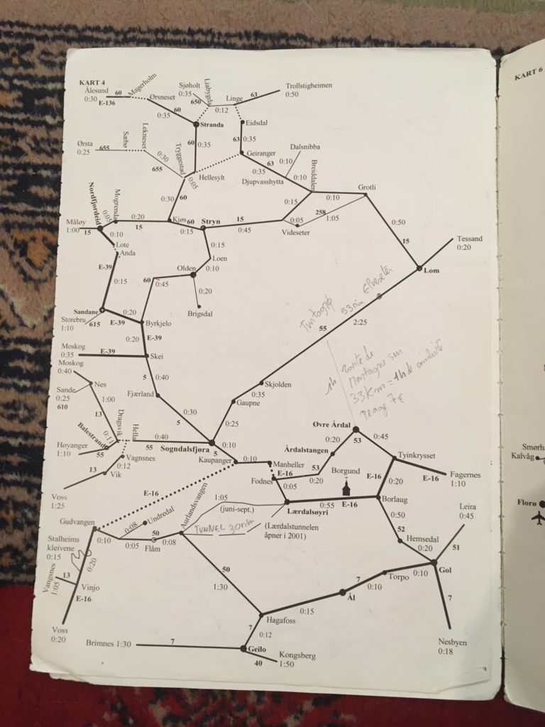 Les cartes, les plans, les atlas, les guides jalonnent mon existence au point que j’en suis, moi même, devenu un, de guide. Moi qui me cogne partout, qui n’ai pas grand sens pratique ( pour ne pas dire aucun ) qui suis l’exemple même de la désorganisation, j’évolue, paradoxalement, en permanence dans l’orbite de ces outils qui organisent l’espace : cartes, plans, atlas, guides. On m’offrit mon premier atlas, bleu, de grand format, à couverture rigide, le mot « Atlas » gravé en or sur la couverture, pour mon passage au collège. J’avais onze ans. Toute la classe en avait reçu un. Je le possède encore. C’est sur celui ci que j’ai effectué mon premier grand voyage : En Australie. C’était certain, me disait mon camarade de classe, là bas, on vivra bien mieux qu’ici, il y a tellement d’espace … et puis AC/DC ! Cet argument massue du jeune joueur de guitare électrique qu’il était ne m’avait pas convaincu mais j’avais aimé, en esprit, construire cet envol, loin de ma cité HLM. Et puis, ça le rendait terriblement vivant, le copain, ce projet, secrètement déployé dans les replis de la carte géographique de la page 144. Il a fini par devenir véto, le copain. Je ne sais s’il joue toujours de la guitare, moi oui. Je ne sais s’il y est allé, pour de vrai, en Australie, moi non. Mais ce fut là mon premier ailleurs, presque à portée de main tant nous étions sérieux dans la préparation de cet exil. Avant cela, j’avais comme tous les enfants, possédé un petit planisphère. J’éprouve une profonde fascination pour ces objets : planisphères, mappemondes, globes terrestres. Je trouve cela extraordinairement beau, indispensable. S’il y en a un où je me trouve, je ne peux m’empêcher d’aller le voir, le lire un instant, d’observer ses couleurs, ses polices de caractères, le faire tourner, si c’est un globe. Non pas pour l’analyser, juste pour m’y perdre. Pour reprendre le lien amorcé plus haut avec les guitares, elles me font le même type d’effet : si je viens chez vous et que vous en avez une, je ne parviendrai pas à m’empêcher de vous demander le droit de l’essayer. Lorsque je pénètre dans un lieu, quel qu’il soit, ce qu’il contient agit sur mon humeur. Si j’y trouve l’un ou l’autre de ces deux objets, je m’y sentirai plus disponible et mieux à l’aise que s’ils n’y sont pas. Je travaille dans un bureau sans fenêtre. C’est mon ancien studio de musique, insonorisé, d’où l’absence d’ouverture. Pour pallier à cet enfermement, j’ai placé sur un mur presque entier, une immense carte du monde. Conséquence de l’importance que celles ci ont prises dans ma vie. A l’âge de trente ans ( j’en ai à présent cinquante six ), j’ai entrepris, sur la seule base de guides, de plans, d’atlas et de cartes, la construction d’une version de moi même qui allait m’accompagner jusqu’à aujourd’hui. Moi qui n’avais jamais voyagé autrement que dans ma tête, ou en stop dans les limites du territoire qui constitue mon pays de résidence, comme beaucoup d’adolescents, voilà que soudainement, j’allais partir en Norvège. On m’y attendait comme guide touristique et je n’y avais jamais mis les pieds. Il y avait quelque chose d’incroyablement drôle et séduisant dans cette proposition. D’assez terrifiant aussi. Durant les quelques mois qui précédèrent mon départ, j’arpentai cette Nord -vegen, littéralement : route du nord, dans tous les sens d’une carte déployée sur ma table avec des guides Michelin, Gallimard, une bibliothèque de conteurs, d’explorateurs, d’historiens. Je me plongeai dans les cartes, les lettres, les symboles pour en extraire des trésors: Les cryptogrammes Samis sur les tambour chamaniques, formaient une cartographie mentale de ce peuple qui m’émerveilla lorsque j’en trouvai la traduction. Fridjof Nansen, Roald Amundsen, les convois de Mourmansk, Narvik, les explorations vikings… J’élaborai des récits à partir de tracés et d’histoire, de latitude, de longitude, de reliefs, de frontières. J’allais devoir rendre tout cela vivants, comme un acteur incarne un personnage, ici nommé Norvège, afin que personne ne doute de ma légitimité à guider ce lieu inconnu de moi. Bien sur, après toute cette préparation, il ne l’était plus tant que ça inconnu pour moi. J’en avais acquis une connaissance mentale qu’il restait à faire concorder sur le terrain. Nous étions en 1997. Il n’existait pas encore de GPS ni de smartphones. Tous les déplacements se faisaient cartes à la main. Mais très vite, dans ce pays de montagne, les cartes routières habituelles, si belles soient elles ( j’en ai encore plusieurs à la maison ) s’avérèrent insuffisantes. Ici, on ne compte pas les distances mais le temps. Un chauffeur routier avait eu l’idée génial d’appliquer ce constat à la cartographie. Durant plusieurs années, il nota chacun de ses déplacements, aller-retour, par mauvais temps ou par soleil, dans tout le pays : 2000 km du nord au sud, établissant des moyennes et finissant par obtenir un temps de déplacement précis pour chaque segment de route du pays. Ce travail titanesque, il le réserva d’abord, sous forme de photocopies, à ses collègues, ceux de sa compagnie de transport, puis, son employeur en fit une petite édition. Le bruit courait sur les routes qu’un gars un peu fou avait réalisé cet exploit de dresser une carte complète du pays uniquement sur les temps de route. Nous autres les guides cherchions comme un Graal quelqu’un qui pourrait nous en vendre une copie. Mais ce n’était pas dans le commerce. Il fallait pour l’obtenir gagner tacitement le respect des chauffeurs. Ceci acquis, un jour, l’air de rien, à la norvégienne, le gars qui conduisait votre bus vous tendait le précieux fascicule, accompagné d’une remarque du type : « don’t loose it and don’t copy it.» . 
