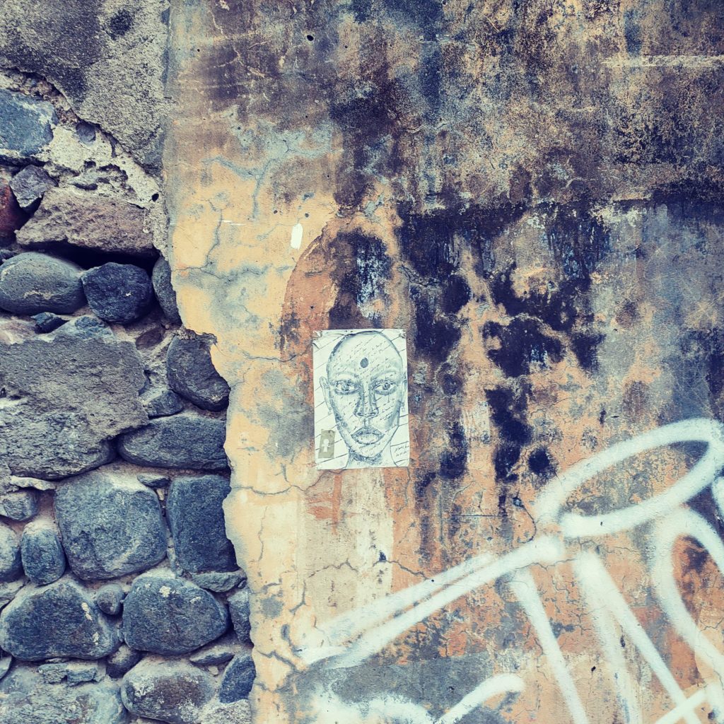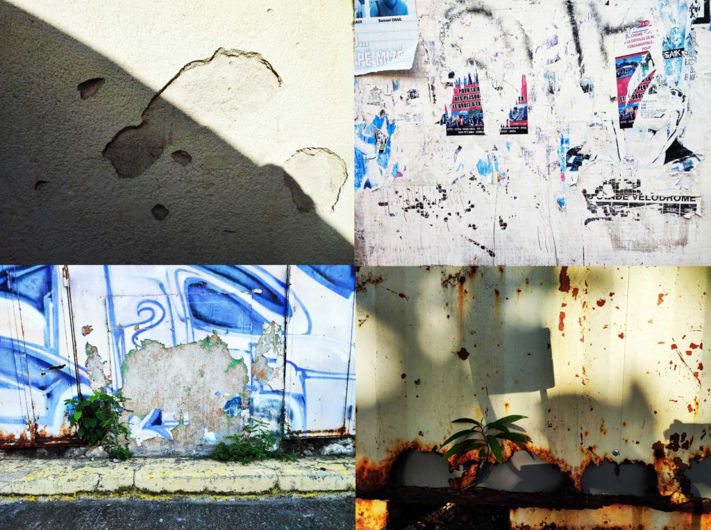 La ville s’effrite. Trou gris dans le mur écru. Mise à nu du béton. Un trou en forme de pas. L’empreinte d’un pas dans le mur. Sous le pas, un autre trou en forme de fer à cheval ou de coquillage. Mur-fossile défait. Et autour encore d’autres trous, plus petits ceux-là. Comme des impacts de balles. La ville s’effrite. Là encore, le revêtement en ciment est tombé. Le mur graffé en volutes mauves et violettes se délite en bas en une mosaïque de béton gris rouge brique vert mangée par les herbes à la croisée du trottoir de bande jaune défraîchi. La ville s’effrite. Mur palimpseste. Petits carrés plus très blancs à force. Colle. Papier. L’un sur l’autre. Bleu rouge noir blanc. Traînées noires. Lambeaux. Lessivés douchés séchés cuits et recuits. Bouts sur bouts déchirés d’affiches militantes et publicitaires sur bout de visage de clown avalé par les droits des travailleurs et les billets en prévente. Esquisses de traits noirs nez bouche yeux. Seuls restent. Assez pour reconnaitre la jovialité. La ville s’effrite. Dentelle de tôle rongée piquée tachée de rouille. La ville s’effrite.