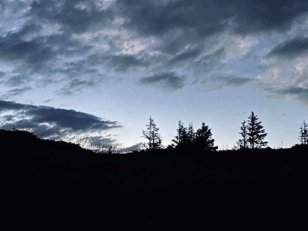 Nuit d’été, lumière bleu marine, pas du noir et blanc, du bleu foncé et du blanc bleuté. Les nuages diffusent la lumière de la lune. On y voit assez pour marcher, pour se déplacer en levant bien les pieds pour ne pas se laisser surprendre par le caillou qui dépasse. Pas d’étoiles, pas de repères dans le ciel. Juste le ruban plus clair du chemin, regarder par terre, les ombres des arbres couchées en travers, mikado aplati, casse-tête sans épaisseur. Les ombres se mélangent, tracent des mots étonnants. Le vent les fait bouger, les feuilles posent leur ombre, leurs doigts, leurs mains, elles tâtent le sol, se préparent pour l’automne, pour la chute.