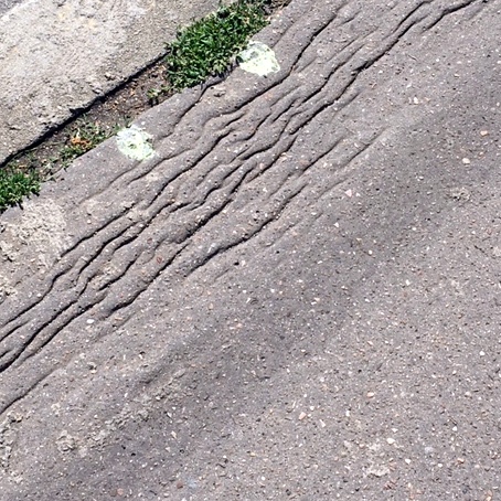 Marches ébréchées, la cinquième et septième à la montée.( bien faire attention de ne pas poser le pied dessus). Brin d’herbe et petite fleur jaune dans l’interstice entre la dalle de béton et le goudron de la rue ( ne pas arracher, laisser son temps de vie à la fleur). Ombre portée des arbres sur l’étroit talus entre le collège et la rue ( profiter de l’étoffe de cette ombre). Bouche d’égout ronde cernée d’une auréole de béton plus claire : SOVAL écrit dans un petit rectangle et EAUX PLUVIALES au centre de la bouche et en plus petit FBM France et MAXUM en arrondi au-dessus de l’inscription principale (jamais regardé avant ce jour les inscriptions sur ce rond métallique, s’en trouver bête). Un tapis d’aiguilles de cèdres le long de la bordure sur le goudron (une pelouse marron où marcher sans bruit et s’imaginer presque dans un sous-bois). Une bouteille en plastique échouée le long du grillage du collège. Une feuille de papier blanc perforée, froissée, avec des dessins au stylo bille abandonnée sur l’herbe ( sans doute une feuille de cours, la fin d’année est proche et les classeurs des collégiens s’allègent). Une canette d’aluminium compressée. Après le virage, le long des immeubles, les traits horizontaux de l’ombre d’un portail où les pieds d’un enfant jouerait à cloche-pied ( ne pas sauter sur le trait noir, ne pas le toucher, sinon tu vas mourir). Sigle de l’indication de la voie verte qui démarre tout près ( j’avais pris à tort ces logos pour des points de rassemblement…). Bande rugueuse au bord du trottoir avant de traverser une rue ( on sent bien sous la semelle les alvéoles bosselées ). Une allée bétonnée et le logo de piste cyclable (trottoir à partager, rester vigilant).. En bordure de cette allée de grosses pierres pour empêcher les véhicules de se garer. Lever la tête, traversée du boulevard :regarder à gauche, à droite, à gauche ( les réflexes perdurent). L’ombre des vélos de la station des véliverts. En-dessous du pont, les rails du chemin de fer bien droits et épais, et là tout près ceux du tram avec les bifurcations possibles ( il n’y a plus de droite ligne mais des enchevêtrements) . Trop dangereux de ne regarder que ses pieds : voitures, trams, vélos, rester vigilant. Longer le parking de la place et les ridules du goudron ( on se croirait sur le sable de la plage ). Encore une rue :larges bandes blanches un peu effacées du passage protégé, (respecté par la première voiture qui arrive). Les magasins de la place avec une femme puis un homme assis par terre, un devant la boucherie, l’autre la boulangerie. Seuil de la boulangerie. Ôter les lunettes de soleil. Le carrelage clair et le regard qui se lève vers l’étal de gâteaux et de pains : bonjour, une campaillette et le journal s’il vous plait. ( défi relevé et terminé sans s’être fait renverser par un véhicule).