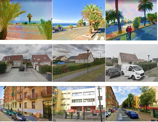 Rue dessinant un coude dans une zone pavillonnaire entre des petites maisons parallélépipédiques à toits pointus, souvent de tuiles parfois d’ardoises. Bas-côté herbeux. Jardins entourés de haies basses, touffues. Une piscine hors-sol ronde et bleue dans un des jardins, séparé du jardin mitoyen par un grillage. Le coude de la rue ne rompt pas la monotonie de l’ensemble. Voitures garées devant le portail des maisons ou devant leur garage. Nuages lourds, foncés, luminosité contrastée. Quelques lampadaires vert foncé le long de la rue. Devant une maison, une camionnette blanche est garée, portières ouvertes. La silhouette d’un homme en t-shirt noir apparaît derrière la portière gauche, son bras replié, la main possiblement contre son oreille.