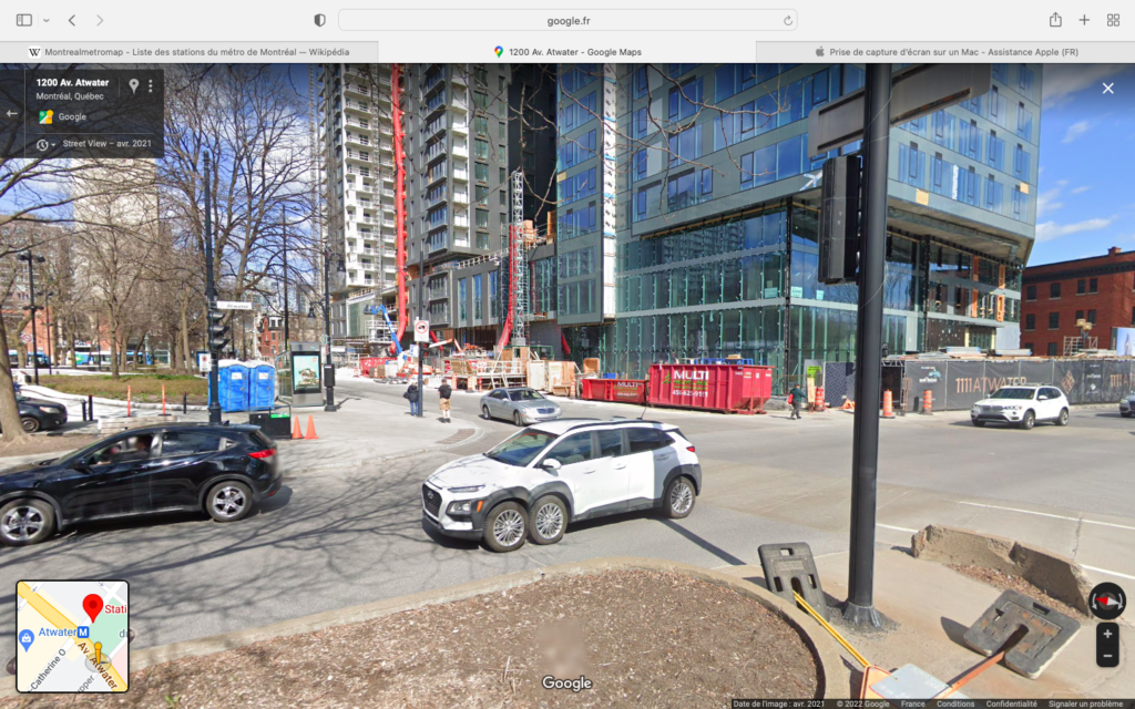 station Atwater, ligne verte. De l’autre côté de Sainte-Catherine Ouest, une grande façade noire. Derrière un carrefour, un grand immeuble Xerox. Derrière un parc, tout en arbres et béton. Au milieu, une statue. Impossible de l’identifier. Des buildings, des grues. Une drôle de voiture que Google Maps a transformé en véhicule futuriste avec six roues et trois portes sur le côté. Il y avait un petit marché dans le temps. Je ne me souviens plus où il se trouvait.