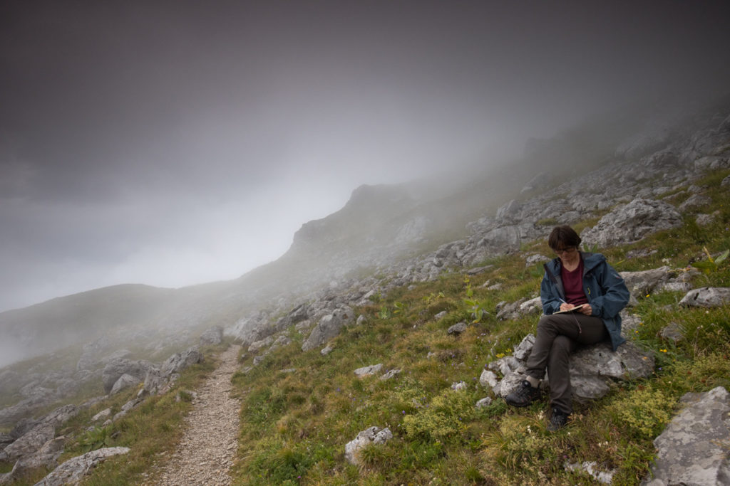 Écrire des présences, tout un monde de vivants, personnages familiers de films animés, rires et sourires, contes doucement versés dans mes oreilles d’enfant, écrire tout ça, là, assise sur un caillou dans un alpage désert, entourée de nuages. Même les moutons et les oiseaux ont disparu, effacés par la brume, les chants et bêlements distancé par le vacarme de la pluie qui vient de s’arrêter et va bientôt reprendre. Écrire la foule dans la solitude.