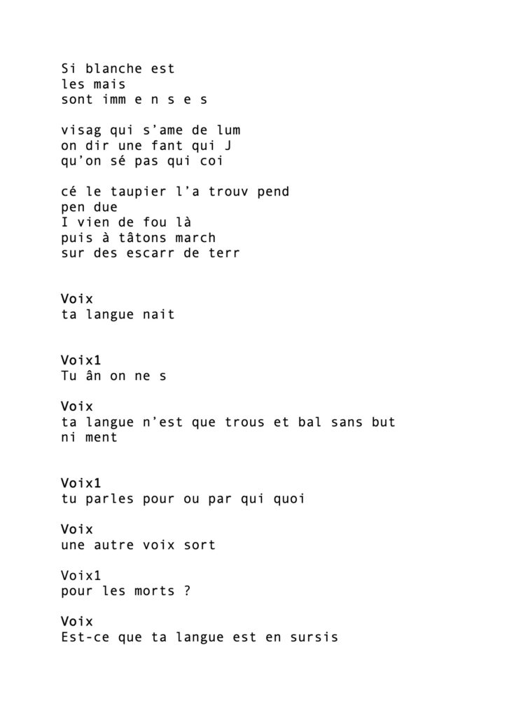Je pris la direction du poème, traversai le couloir entravée des chevilles aux poignets : Tu devras lui faire la voix, m’avait dit le geôlier. Le poème avait jeté ses vers sur la table à quelques centimètres du bord en grand désordre ; sans queue ni tête ils oscillaient comme des oxyures, ils pouvaient à tout moment basculer et s’abimer dans Continuer la lecture #rectoverso # ps | une deuxième chance en désespoir sans cause