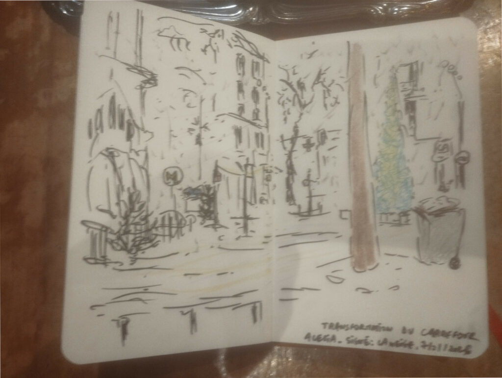Oui, ça a commencé ainsi : des flocons. Ça tombait du ciel. Alors trouver un café avec large vitre. Voir tomber ça en étant abrité. Voir le jour se lever en même temps. Essayer de reconnaître l’individualité des flocons traversant l’epace incertain entre le ciel enténébré et le tapis de la neige rehaussé par les phares des voitures. Dessiner ça et se demander. Dans la langue qui faisait régulièrement intrusion, au temps de l’enfance, on ne disait pas que la neige tombait. On ne disait pas : il neige. On disait : avem la nèu. Nous avons la neige. Pas d’action pour les flocons. L’ici-bas gratifié d’un don. Et moi, je dessine, assis contre la large vitre du café, Alésia. Pourquoi pas, après tout ?