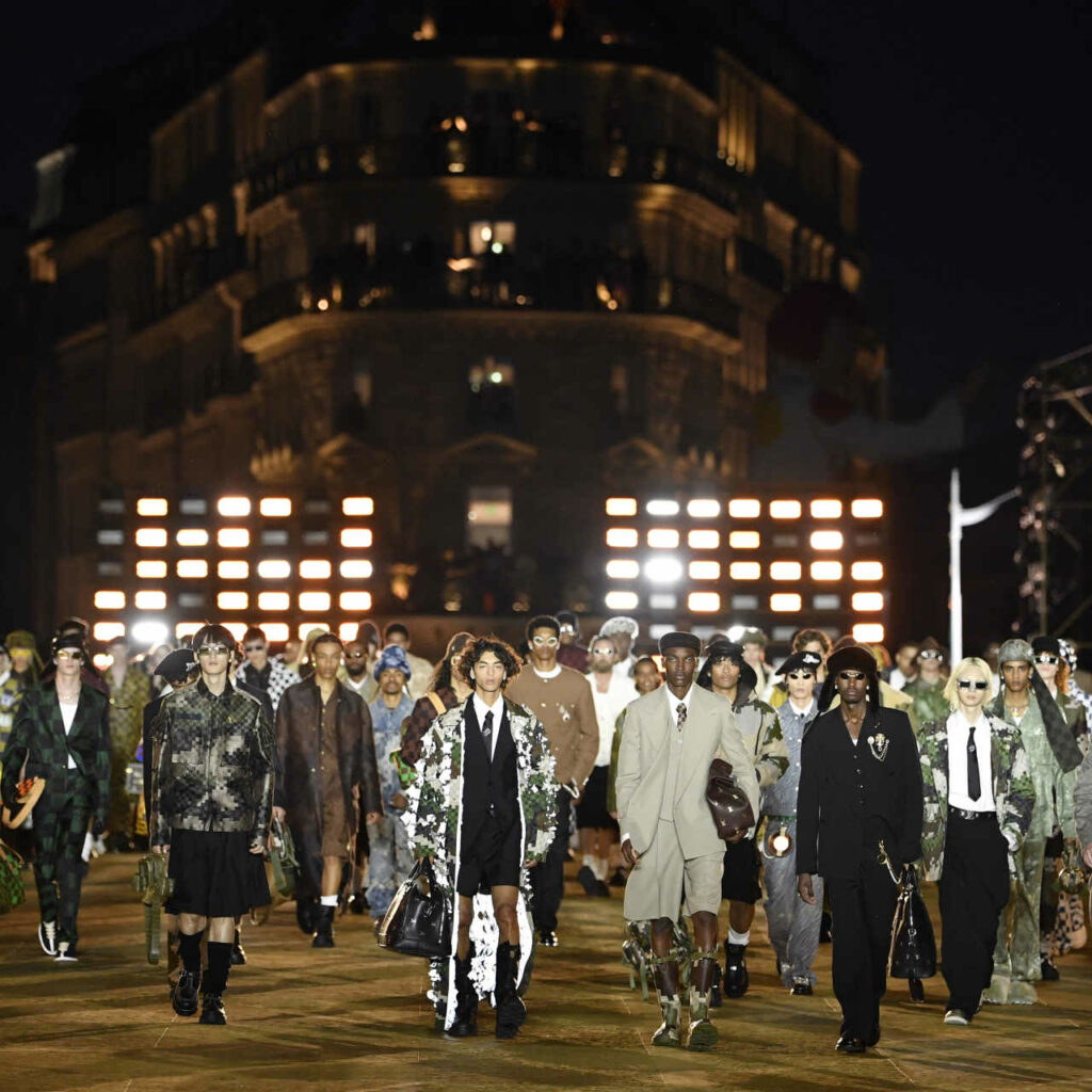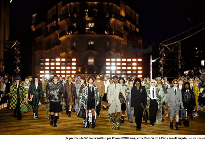 (longueur des manteaux et des longueurs des jambes de pantalons, mur de spots dimension télé, lunettes de soleil longueurs des tifs, lissages des genres (il s’agit de la collection homme), lissage des couleurs de peau – on ne mentionne pas dans la 2 le metteur en scène responsable de la proposition « immersive ») (la mairie de Babylone a loué le pont Neuf mais est-il possible de refuser cette faveur à machin qui possède la moitié de l’arrondissement ? (il me semble me souvenir que Damasio (dans son Les furtifs) renomme la capitale du nom de la marque du wtf maroquinier – l’espace public est privatisé parce que « ça c’est Paris » (le prix de la location est tu mais la maire était-elle invitée ? ) – et ses abords (depuis la place de la Concorde) pour le raout – quelque mille cinq cents « happy few » comme les intitule le canard qui appartient, lui aussi, à la marque – de la nécessité de foutre en banlieue les nécessiteux)