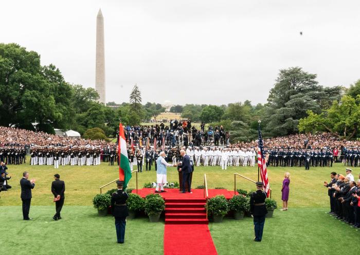 Le président américain Joe Biden serre la main du Premier ministre indien Narendra Modi lors de sa cérémonie de bienvenue sur la pelouse sud de la Maison Blanche à Washington, DC, le 22 juin 2023. (Photo par Andrew CABALLERO-REYNOLDS / AFP)