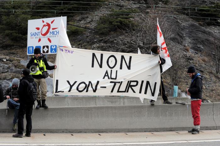 (FICHIERS) Les manifestants brandissent une banderole sur laquelle on peut lire « Non à Lyon Turin (Italie) » alors qu’ils tentent de former une chaîne humaine qui s’étend de Saint Michel-de-Maurienne à Saint Martin-de-la-Porte, à environ 5 km , dans le sud-est de la France, pour protester contre la pollution dans les régions alpines, le 7 mars 2015. Une manifestation prévue ce week-end par des manifestants contre le chantier de la ligne à grande vitesse Lyon-Turin TAV (Treno Alta Velocita) sera interdite par les Français Préfet du département de la Savoie, en raison de « risques d’épidémies » qu’il a annoncé le 15 juin 2023. (Photo de JEAN-PIERRE CLATOT / AFP)