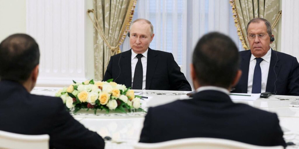 Le président russe Vladimir Poutine (L, 2e rangée), flanqué du ministre russe des Affaires étrangères Sergueï Lavrov (R), écoute le Premier ministre et ministre des Affaires étrangères du Qatar Mohammed bin Abdulrahman bin Jassim Al Thani (L) lors de leur rencontre à Moscou le 22 juin 2023. (Photo de Sergei BOBYLYOV / SPOUTNIK / AFP)