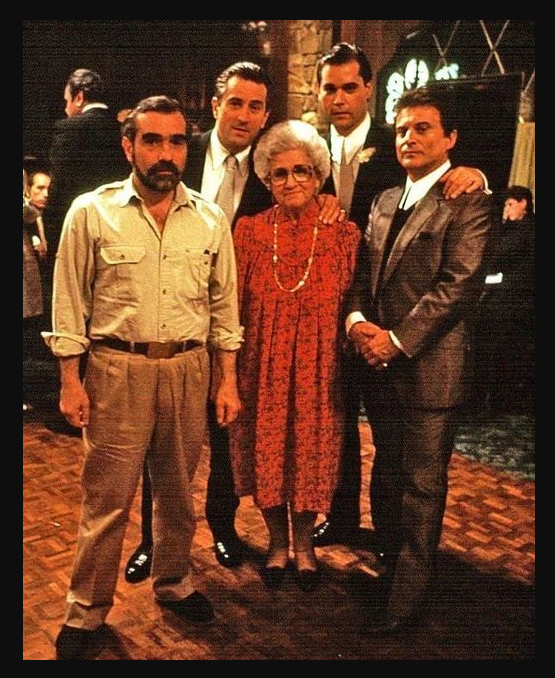 Martin Scorcese, Robert De Niro, Catherine Scorcese, Ray Liotta,Joe Pesci -photode plateau durant le tournage du film Les affranchis (1990) (au dialogue (relevait alors un critique plus ou moins cinématographie) du film tous les 3 mots « fuck » ou « fucking » ou « wtf »)