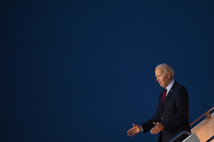 Le président américain Joe Biden débarque d'Air Force One après avoir atterri à l'aéroport de Stansted le 9 juillet 2023. Biden est arrivé dimanche en Grande-Bretagne pour rencontrer le Premier ministre Rishi Sunak et le roi Charles III, avant de continuer vers Vilnius pour un sommet de l'OTAN, puis une dernière étape. dans le nouveau membre de l'OTAN, la Finlande. (Photo par ANDREW CABALLERO-REYNOLDS / AFP)