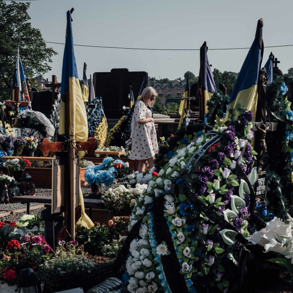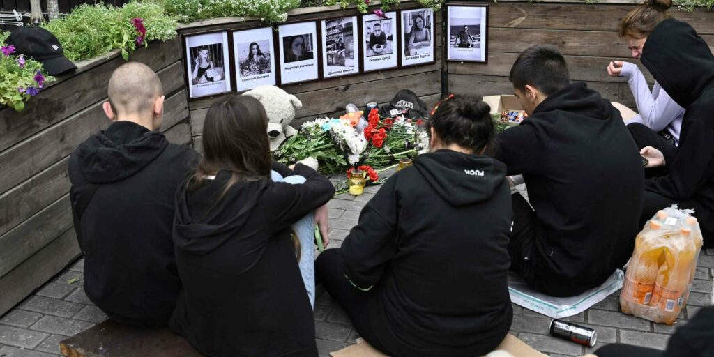 Les amis et collègues des membres du personnel tués se rassemblent pour pleurer devant un mémorial de fortune à côté des restes d'un restaurant détruit lors d'une récente frappe de missiles, dans le centre de Kramatorsk, le 29 juin 2023, au milieu de l'invasion militaire russe en Ukraine. Le bilan d'une frappe de missile russe sur un restaurant dans l'est de l'Ukraine est passé à 12 morts et au moins 60 blessés le 28 juin 2023, dont des enfants, le Kremlin ayant insisté sur le fait que les forces russes ne touchaient que des cibles liées à l'armée. (Photo de Genya SAVILOV / AFP)