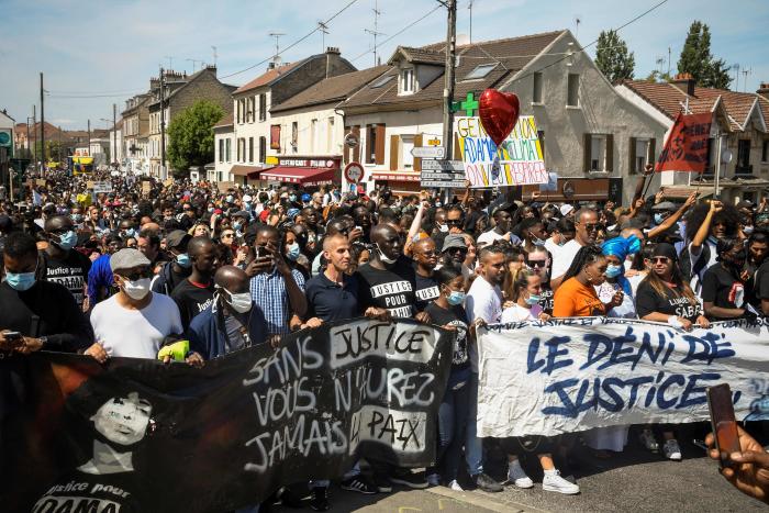 Des personnes participent à une marche le 18 juillet 2020 dans la banlieue parisienne de Beaumont-sur-Oise appelée par plusieurs associations de défense des droits civiques et écologistes pour commémorer Adama Traoré, un homme noir décédé en garde à vue il y a quatre ans, et pour protester contre les violences policières. /AFP/Bertrand GUAY