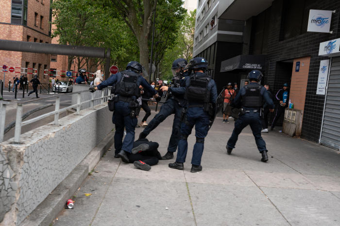 add 19h15 : de mal en pis (nan mais la manif était interdite et en plus le type est noir des dreads tout ça, tu comprends bien) – Yssoufou Traoré devant le commissariat de police du premier arrondissement de Paris – bilan de son interpellation (on dit musclée, tu comprends bien aussi) musclée : une fracture du nez, un traumatisme crânien avec contusion oculaire, des contusions thoraciques, abdominales et lombaires révélatrices –
