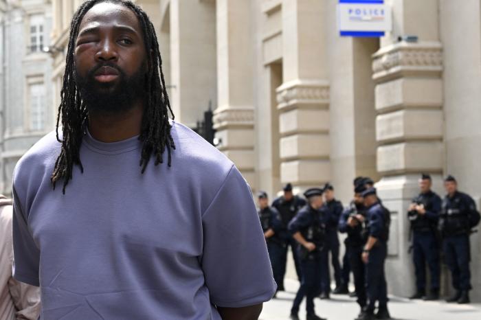 Youssouf Traoré, membre français du Comité Vérité et Justice pour Adama, regarde devant un commissariat du 1er arrondissement de Paris, lors d'un rassemblement pour exiger la libération des manifestants en garde à vue, le 9 juillet 2023. Une déclaration commune de gauche- Des associations, syndicats et partis politiques de tendance avaient appelé à un rassemblement le 9 juillet 2023, après-midi devant un commissariat du centre de Paris pour exiger la libération de Youssouf Traoré et d'une autre personne détenue avec lui. Youssouf Traoré, 29 ans, a été arrêté par la police le 8 juillet 2023, au milieu de manifestations à travers le pays qui commémoraient la mort de son frère Adama Traoré en 2016, dont beaucoup au mépris des interdictions de rassemblement de la police. (Photo de Bertrand GUAY / AFP)