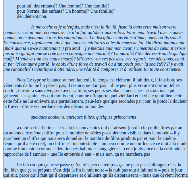 - un espion aimant la perfection et la disparition des traces (car ôter la vie au vieux salopard en fait disparaître l'existence même, très probablement - quoi qu'il en puisse être, il n'existe pas - ou il n'existe plus - ou on n'en entendra plus jamais parler) - la "panne" dont il est question était au centre des agissements de ces moments-là - depuis (dit le déroulant "propriétés" sous l'onglet) (onglet ?) le 27 janvier de cette année-ci (le texte a été écrit d'une part, il y a un bon moment (les ateliers d'été de 2020 dis-je au hasard), mais aussi repris quelque part par là (dans les pdf de ce word-press-ci il doit en rester une version) - les allongements peut-être en italiques (je ne parviens pas à poser dans le texte ici ceux qui figurent dans l'original - je pose une image du texte :peut-être aurais-je dû en faire autant pour tout le texte d'ailleurs mais je n'en ai pas eu l'idée : c'est trop tard...) - ça ne fait rien, c'est un atelier - il se peut que j'avance, pourtant