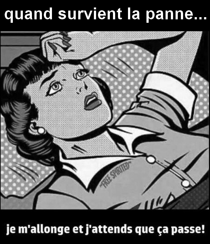 « Que faites-vous quand vous êtes en panne ? » Sérieusement ? Pour répondre à cette question, il faudrait déjà avoir démarré… et avoir vaincu la procrastination. Comment je fais ? Simple : je ne fais pas. Je remets à plus tard. Je fais autre chose. Il y a toujours un truc urgent qui attend. J’abandonne. Me vautre dans la paresse scriptoriale. Visite YouTube. Lis. Ce qu’écrivent les autres est tellement meilleur que tout ce que je pourrais… Me livre, comme ici, à de mauvais jeux de mots. Exerce ma créativité en cuisine. Parfois, c’est la chance : en tournant la sauce, une idée, une image, comme une bulle, remonte et éclate en surface. Mais on ne peut abandonner la sauce, sinon elle attacherait, et la bulle, l’idée s’évapore avant d’avoir été notée, écrite.
