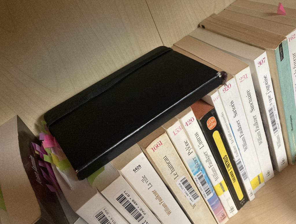 Celui-ci. Posé à plat sur la rangée de bouquins dans la bibliothèque. Au hasard. (Parfois Il se déplace – quelle magie – quelle anarchie – quelle impulsion – quelle nécessité ?) Aujourd’hui sa nomination. Élu pour figurer en prologue à côté de tous les autres racontés pour dire comment se fait carnet ! – griffonnés gribouillés jaunis remplis ou moitié vierges avortés – toute la variété à peine esquissée : les longs les carrés les fins les épais, se tiennent ou non à carreaux, avec et sans signets, doux durs à caresser. En somme un parmi d’autres du peuple immense et discret des carnets. Noir. Allongé sur le rayon Faulkner – mélange de Folio/Gallimard/Poche. Livres de tailles inégales, carnet de guingois – air penché comme un clin d’œil. Connivence. Familier. D’apparence seulement délaissé – importance de le savoir là : l’œil parfois trouve caresse invente le carnet au sommet : Si je t’oublie Jérusalem Absalon La ville Le hameau Pylône L’intrus L’intrus (oui, 2 fois ?!) Le caïd et autres nouvelles Sartoris. Ça précède bien sûr dans l’avant continue évidemment dans le plus loin mais voilà c’est pour te dire la longueur du carnet un peu de biais et je l’ai dit, de guingois. Vieux. D’autres bien sûr sont venus succédant à çuilà. Sous les piles de papier du bureau bois miel, dans le sac de l’appareil photo dans la poche du manteau sur d’autres livres etc… Mais des comme lui aucun. (Mais tu ne sais pas utiliser les carnets – tu t’en mets partout ! tu commences et tu finis rien – tu te disperses tu boulimismes anorexises déjectionnises. Tu ne sais plus ce qui s’écrit ni où s’écrit. Tu ne relis pas – tu ne relies pas.) C’est comme ça … Dans le carnet tu aurais dû le noter, en travers et en gros : POURQUOI ? Compact. Tient dans la main. Peu pratique finalement. Pages plutôt étroites. Difficile de l’ouvrir bien à plat, laisser filer le stylo jusqu’au bord c’est se jeter dans le vide chuter recommencer chuter encore. Dedans de tout : des rêves des notes de conférences, choses vues – entendues, des idées clignotantes … Lumineuses éteintes lumineuses. Des schémas du bleu du noir des images des phrases des visages flottent… Tiré un jour de la poche de la veste bleu-marine en coton rêche. Sur les genoux ? Sur la tablette rabattante de la chaise ! Le visage se rapproche… Bruissement de la salle, tiédeur des corps, le souffle roux dans l’oreille : « …mais qu’est-ce-que tu écris ? Fais voir… » ! Corné. Petites écorchures blanches au sommet et à la base de la reliure, blessures de peau, centré au bas de la couverture tatouage Moleskine. Sous son cuir à droite le petit repli du soufflet pour rangement minimaliste. La feuille en accordéon multilingue pour raconter Van Gogh Picasso Hemingway – Moleskine etc… Un post-it de Rendez-Vous : Mardi 10 Novembre à 18h45, Tampon bleu, Psychologue Psychothérapeute Psychanalyste, une page pliée repliée de libération, Lire le Mag, date 27 Septembre 2009, encadrés au bic bleu deux extraits d’articles « … est un auteur génial. On lui doit un des plus jolis titres de la littérature policière : Beyond this point are Monsters (Le territoire des monstres.) C’est ce que les cartographes de l’Antiquité écrivaient sur les bords de leurs cartes marines, pour indiquer la limite du monde connu. » et un autre pavé étroit également encadré plus bas : « … de Maugham lui-même. Dans ce livre (où il parle entre autres choses des journaux intimes des écrivains), il a une phrase qui est une des plus tristes et des plus sages que je connaisse : « On se lasse même des bonnes choses. » Près de moi carnet obstiné en quête. Faussement repu derrière son élastique en bandoulière.