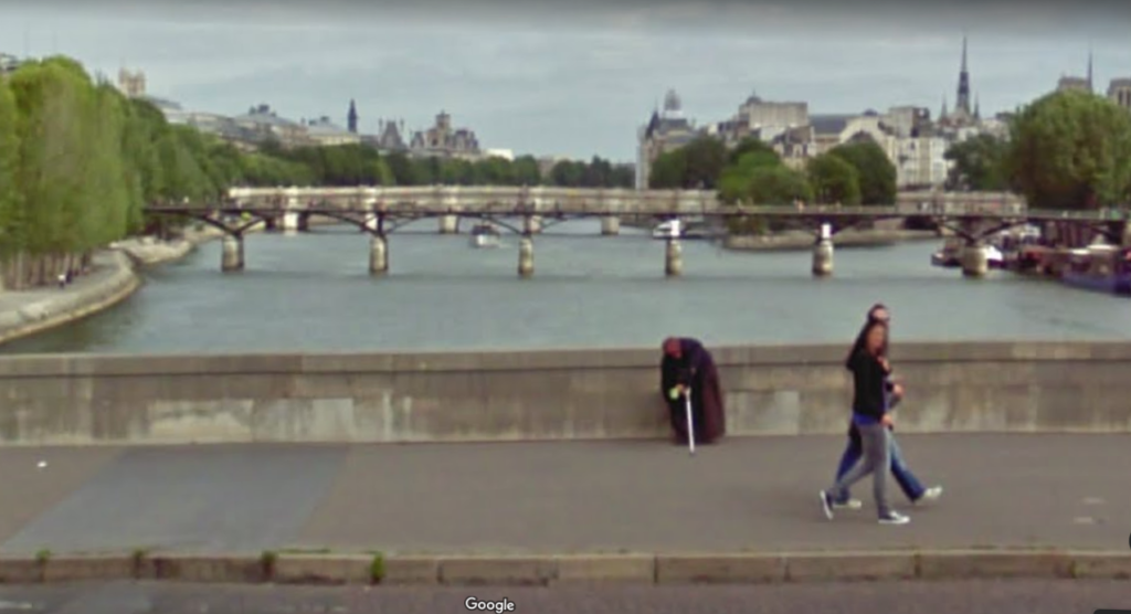 une mendiante (plus ou moins fausse) sur le pont du Carrousel (au fond la passerelle des Arts (Le Vent) et le truc de Notre Dame qui disparût en avril dernier)