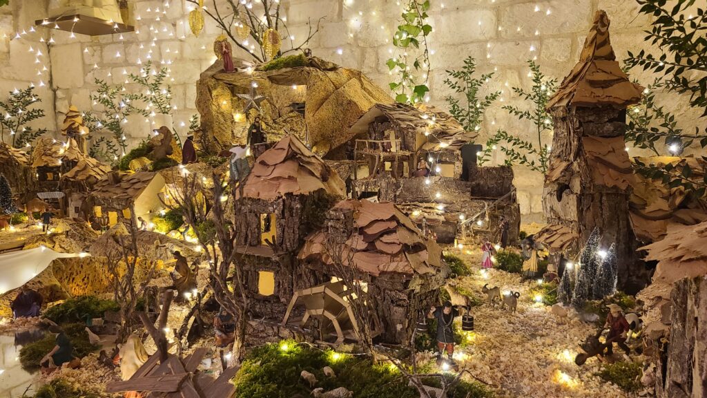 Les derniers articles sont plus légers. Je les ai consacrés aux décorations de Noël qu’on trouve dans les villages. Les façades et les jardins de certaines maisons richement illuminées. Les bougies, les étoiles, les lutins farceurs en chorale de pères Noël, l’équipe de pingouin et un ours blanc pour une partie de hockey, un traîneau plein de cadeaux, presque une crèche à l’échelle du village installée par une équipe de bénévoles. Et puis la crèche nichée au fond du chœur d’une église, vraie maquette artisanale où la Nativité trouve sa force dans le village bricolage, la toile aussi lourde que souple, couleur de roche, mousse, brindilles, branchages, sciure de bois et plaques de glace, de l’écorce pour les murs, des copeaux pour les toits, maisons, moulin à vent, moulin à eau, colonnades, église, une caverne pour l’étable divine, une foule de personnages et d’animaux saisis dans le vif de l’action, au travail, en marche, et ses guirlandes où les étoiles viennent flirter avec le sol pour une union du ciel et de la terre, du jour et de la nuit, et sans doute des infinis, grand, petit, éternel, éphémère…