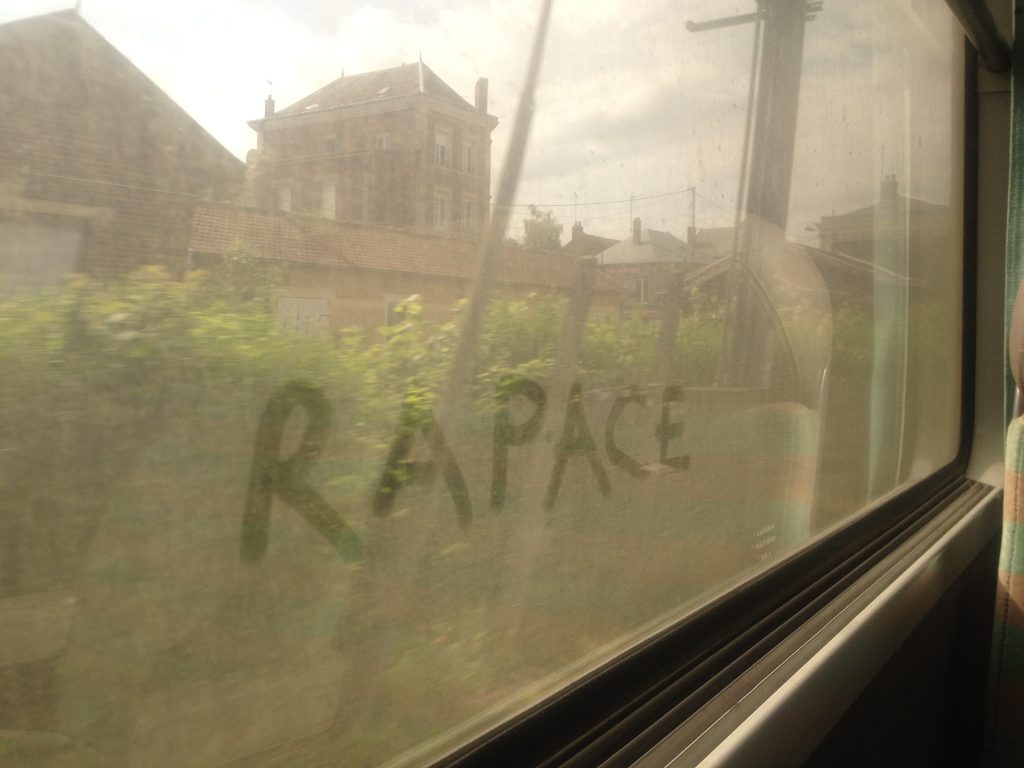 À Douai, le train se déleste d’une bonne partie de ses voyageurs. Je me trouve un carré de sièges vides où je peux étirer mes jambes. Les vitres n’ont pas été nettoyées depuis un moment. Il y a des inscriptions faites au doigt dans la boue depuis l’extérieur. Des petits dessins, des cœurs flanqués d’initiales, des mots écrits en miroir, de manière à ce que les passagers puissent les lire. Qui les a écrits? Qui va zoner dans les dépôts?