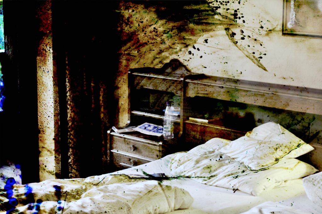 Les fenêtres et les portes s’ouvrent. Les interrupteurs commandent la lumière. L’eau s’écoule des robinets cependant que les murs sonnent comme sonne une boîte vide. Réel vacillant, en attente d’histoire. Et il y a ce plafond sans plafond. Grand trou noir. Gouffre d’où plonger dans l’image. Dans l’image de cette chambre. De cette chambre qui est une scène. Une scène dans un film. Qui est une image. Une image suspendue dans une tête. Maintenant. Elle est à la fenêtre. Elle écarte le voilage. Elle attend …