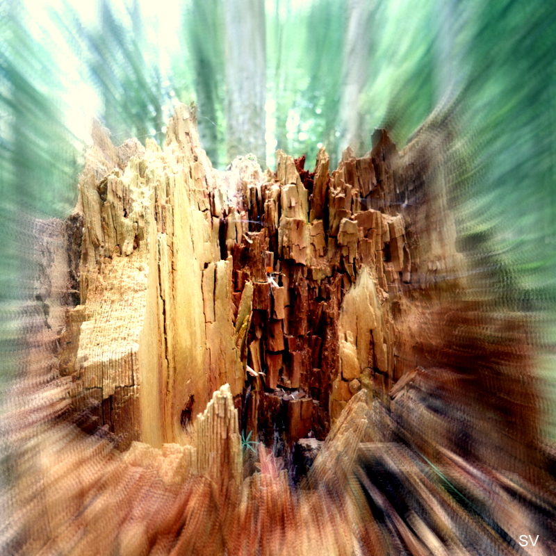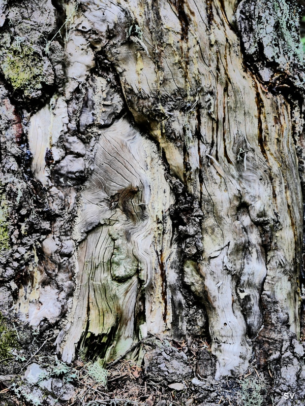 Puis l’œil s’enfonce, délire dans les strates d’un tronc déchiqueté, écartèle failles et fissures comme s’il cherchait à lire entre les jeux d’ombres et de lumières un avenir ou la pulsation d’une vie qui s’échine vers ses derniers instants. Il caresse le relief de ce corps qui s’ouvre, un dedans-dehors qui bouge encore. A l’intérieur, des voix s’évaporent.