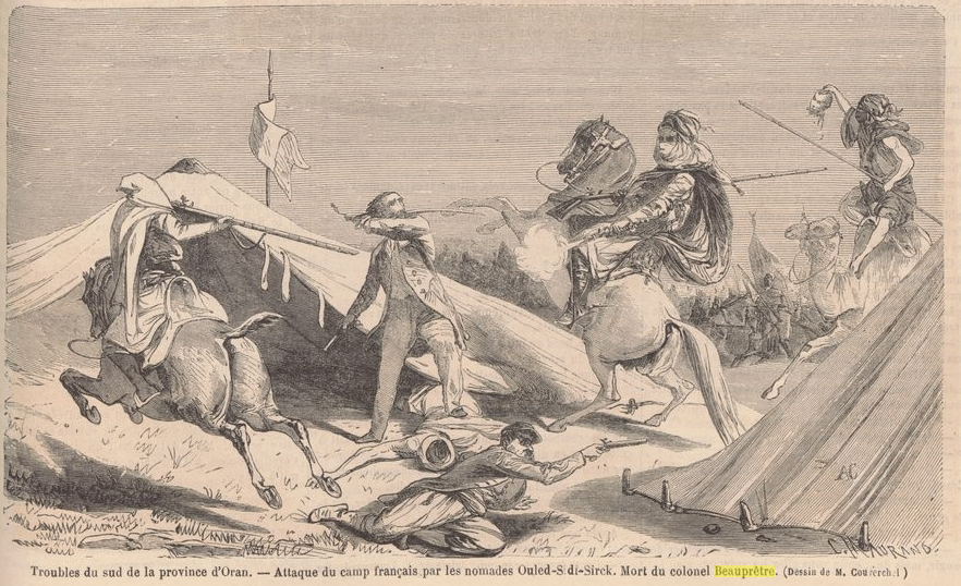 Il y a mieux, il y a Boubrit (Beauprêtre pour vous), un autre héros de la conquête, même âge que Blandan quand il s’engage dans le 1er régiment de zouaves (ils sont nés tous les deux en 1819), il fait son chemin dans l’armée, sergent, sergent-major, lieutenant et chevalier de la Légion d’honneur, capitaine, officier de la Légion d’honneur, lieutenant-colonel, colonel, chacun de ses exploits est relaté dans la presse parisienne et salué malgré la sauvagerie que l’on connaît à l’individu coupeur de têtes qu’il conserve dans une besace accrochée à sa selle. Il est tué en 1864, assassiné devant sa tente. Le village où il est tombé est rebaptisé Beauprêtre en son honneur comme de nombreux boulevards et rues de l’Algérie colonisée. Même si l’indépendance a débaptisé les villages, rues et boulevards, c’est un nom qui résonne encore en Algérie et si tu tapes « Beauprêtre » sur Google Maps, tu trouveras toujours ce nom accolé au nouveau nom de la ville. Dans mon enfance les enfants pas sages, on les menaçait de les donner à Boubrit, le coupeur de têtes qui chevauchait un sac d’oreilles en bandoulière, Malika Domrane lui a consacré une chanson. Je te la ferai écouter.
