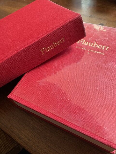Ces deux livres jumeaux ont été dans mes bibliothèques successives depuis longtemps. Je peux indiquer avec certitude la date à laquelle ils sont entrés en ma possession : juin 1965. Ils m’ont été remis à une distribution des prix à l’issue de ma classe de 1ére. C’est indiscutable car collé sur la première page, il y a un petit papier « Lycée Jules Ferry . Tananarive. » Sous cette mention, d’une écriture manuscrite appliquée : Année scolaire 1964-1965 et mon nom. Le lycée ne s’était pas fichu de moi, il s’agit des œuvres complètes de Flaubert en deux volumes, éditées en 1964 aux Éditions du Seuil. La couverture des volumes est tendue d’un tissu rouge vif. En lettres d’or, centrées dans la partie supérieure du livre : « Flaubert » et dessous « œuvres complètes ». Encore dessous une étoile pour le tome 1, deux pour le tome 2. Sur la tranche, en long « Flaubert», en bas une étoile pour le tome 1, deux pour le tome 2 et dessous le nom de la collection : « L’intégrale ». Au dos, en bas, justifié à droite « aux éditions du Seuil » suivi de deux points. Toutes les écritures sont à empattements droits (Georgia sur un clavier d’ordinateur). C’est tout. C’est beau, c’est noble et sobre, d’un luxe discret adapté à la grandeur de l’écrivain. Bien qu’âgés de plus de six décennies, les livres sont parfaitement conservés, non pas faute d’usage, mais parce que protégés par des couvertures en plastique transparent, un peu craquelées, elles aux coins. Première page blanche, deuxième page FLAUBERT, troisième page, une reproduction du visage de l’écrivain, jeune, imberbe et chevelu pour le tome 1, d’âge mûr, dégarni et moustachu pour le tome 2. Page suivante FLAUBERT, ŒUVRES COMPLÈTES, TOME UN ou TOME DEUX, PRÉFACE DE, etc. Suivent les listes des œuvres contenues dans chaque volume. En bas de la page AUX ÉDITIONS DU SEUIL et sur la dernière ligne, 27, rue Jacob, Paris-VIe. Le tout centré et dans des corps différents de la police. Sur la page de gauche. Copyright 1964, by Éditions du Seuil