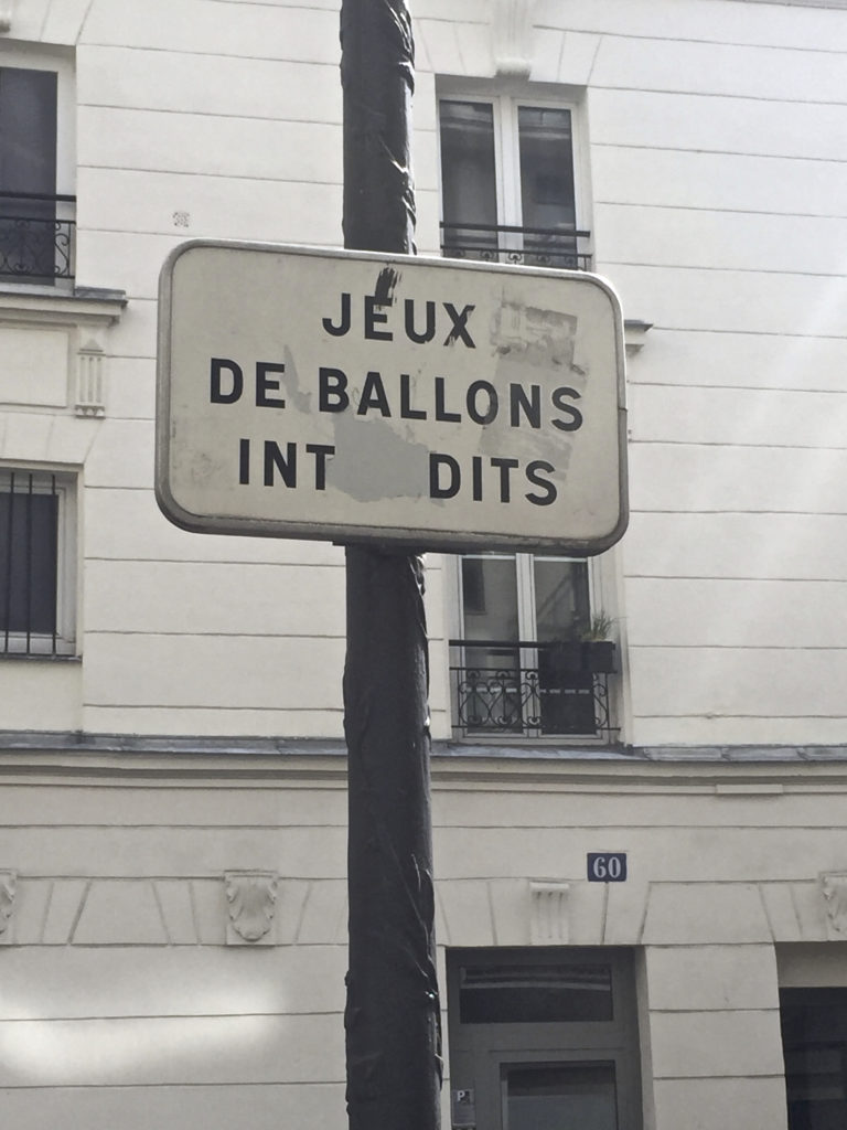La rue est quasi vide même le trafic automobile semble à l’arrêt. Avec mon téléphone, entre les arbres, il y a en quatre, je photographie l’immeuble — je cadre le panneau de la ville qui indique qu’on ne peut pas jouer au ballon sur le grand trottoir qui fait face au 60 — Jeux de ballons int dits est-il écrit… INT DITS — un prétexte — pour deux lettres effacées le bredouillement d’une énigme.