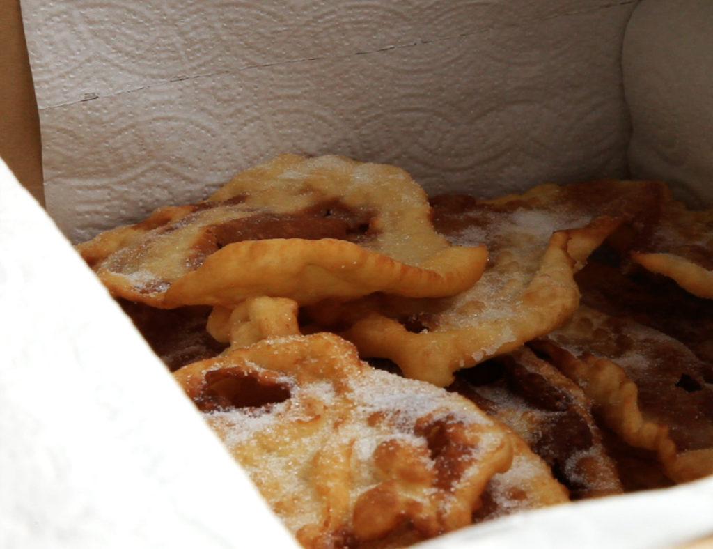 Et la cadence commence. Du dos des phalanges elles aplatissent vivement la chair docile qui virevolte entre leurs doigts, danse aérienne et agile, avant de la déposer sur la cuisse pour la tirer au maximum. Les r qui roulent et les critiques enveloppent la cuisine; elle casse, elle est un peu blanche, elle n’a pas bien levé, elle a trop levé… Il faut tirer rapidement, viser le translucide. Chaque trou est un échec. Les petites sont invitées à observer l’habileté de la fille. Allez on enchaine. On fait pas des oeuvres d’art, mais dis donc elle est pas bien jolie celle-là. Le beau-fils attrape délicatement l’une après l’autre les formes achevées qui ressemblent à du vieux linge mité, les plonge dans l’huile bouillante où elles se contractent, cloquent, dorent dans l’éclat des voix. Elle veille à la rousseur de chaque production qu’il arrose de sucre. Elles refroidissent. Au fur et à mesure, elle les dispose dans le grand carton tapissé de sopalin. C’est le mari qui frit maintenant. Il est pressé, veut en finir, les sort trop tôt de l’huile. Elle crie, il hurle, elle aura le dernier mot: poitrinaires.