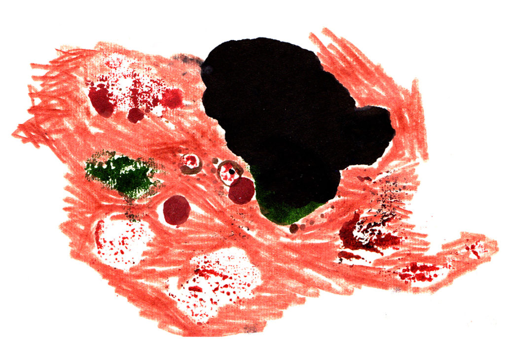 La douleur se fait organe. Pendant que les mouches s’entredévorent dans un bruit de carcasse une foule tonique de patates pointe à l’Est — des patates, oui — projettent leurs nervures jusqu’au centre d’un globe inconnu de chair avide. A l’Ouest surgissent des substances lexicales enlisées en diverses boucles autonomes de questions et de révélations insensées hurlantes dont l’unique but est d’émousser le calvaire. Pourquoi aucune question au monde n’a de réponse ? La tuyauterie va péter.