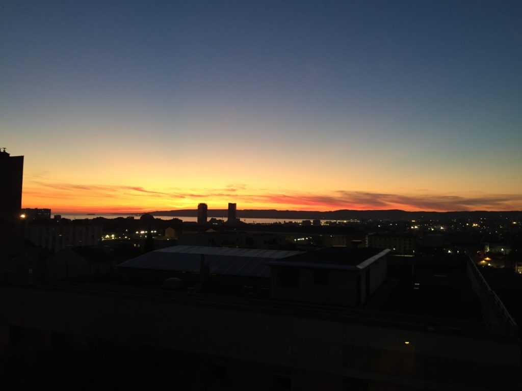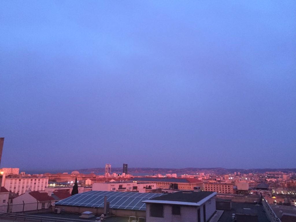 Le soleil habite ici, à Marseille. L’été, il s’endort derrière ses collines, offrant un spectacle à chaque fois plus éclaboussant, sidérant, impossible. Soir après soir les lumières surgissent, drapent les nuages ou le vide, étourdissent la ville, défient l’oeil humain en riant — jamais tes mots, tes pigments, tes pellicules et tes filtres ne sauront rendre mes beautés. A leur suite, le vent salé siffle dans les oreilles et masse droit dans les yeux les chairs où pénètre l’éclat du ciel. Les humains capitulent, évidemment, oublient leurs mains, se troublent, s’effondrent en dedans et refusent de mourir.