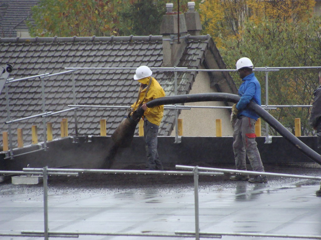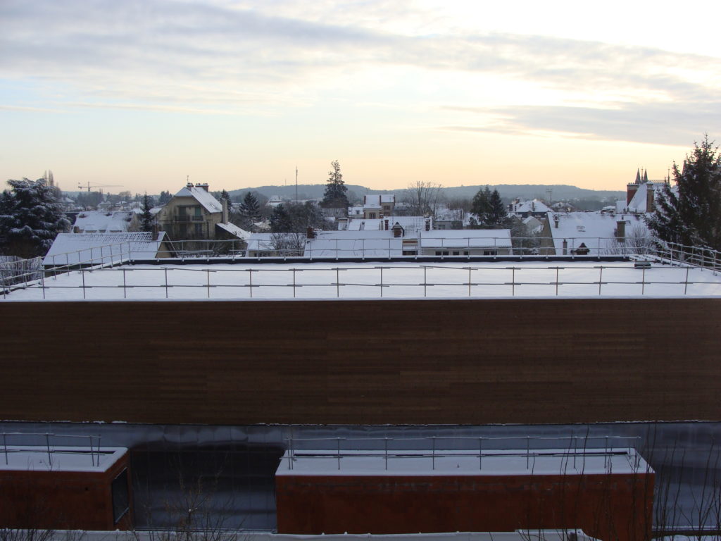 Une petite école primaire. La petite école primaire en face du balcon. La petite école primaire dans laquelle le gymnase est terminé. Les murs en briques rouges, surmontés de murs en bois, surmonté d’un toit végétal, surmonté d’une grille de fer et de métal. Le gymnase est terminé et a mangé toute la cour de récré. La marelle n’existe plus et les coins pour se cacher non plus, fini le vieux et le désuet, fini les cris d’enfants relégués dans le fond de l’autre côté. La rue s’est ouverte, les voitures peuvent circuler et vive la modernité. Le gymnase est terminé et les cadres et ouvriers, blousons et manteaux sur le dos, font le tour, observent, et vérifient. L’hiver est arrivé, il neige…