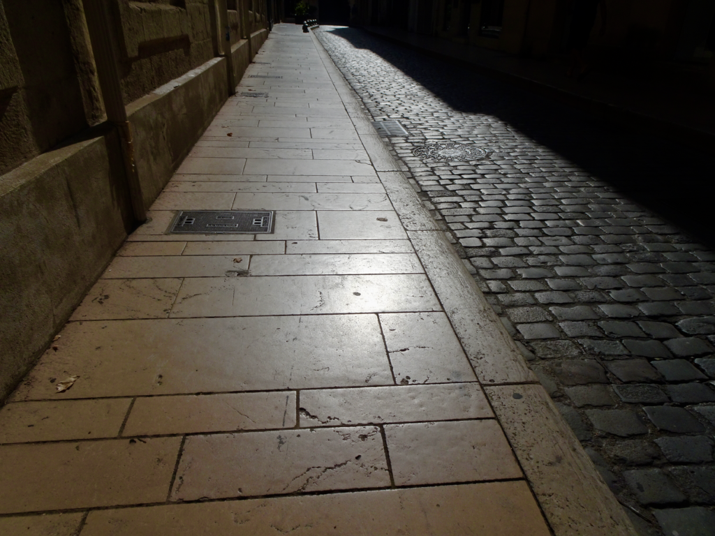 Une ligne de fuite ou une aspiration, une perspective qui évite de peu la symétrie, des bandes opaques, étincelantes ou noires se précipitant vers des petits points luisants et noirs plantés devant une barre sombre qui ferme l’image. A gauche, s’amenuisant en avançant, le soubassement et le bas des murs, avec le jeu de la lumière tamisée qui modèle la pénombre pour marquer le ressaut et la ponctuation de cylindres bruns dressés pour porter ombres sur la pierre grenue. S’imposant ensuite, dans l’éblouissement sous la frappe des rayons de soleil de ce début de matinée, la fuite du large trottoir aux dalles luisantes (avec le petit signe amical d’une feuille morte recroquevillée) dont la blancheur se dissimule dans le mélange de cette luminosité et de la contagion de l’ombre qui envahit le mur, posant avec autorité l’orde d’avancer. La côtoyant, envahissant peu à peu la largeur de l’image, la tentation des pavés frappés joyeusement et irrégulièrement par même lumière mais graduellement (avec une avancée brusque due à la plus grande hauteur des maisons de droite) envahis par une belle et profonde ombre qui dit la fraîcheur et la promesse du petit trottoir qu’elle cache le noyant dans la même obscurité que les pavés et les façades qui la dominent et la projettent.
