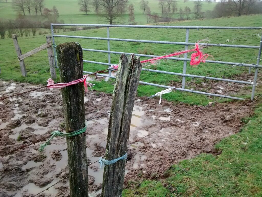 Je pars marcher. Cette fois c’est sûr je ne prendrai pas de photo, marcher dans la simplicité de l’instant présent, ne pas encore une fois, plusieurs fois m’arrêter pour photographier, m’enlever cette idée de la tête, photographier les nœuds, tous les nœuds, zoomer sur les nœuds, me pencher, me déhancher, chercher l’angle idéal, mais oui bien sûr cette couleur de ficelle je ne l’ai pas dans ma collection, m’étonner toujours de la dextérité de l’artiste anonyme qui ne sait pas qu’il arrête mon regard, que la pluie change la lumière de la ficelle, que le soleil à l’aube réveille le rouge, que le ciel se jumelle avec les bleus, fait miroiter l’eau de la terre patinée par des vaches, que l’odeur se mêle à celle du bois des piquets, espérer pour eux une longue vie avant le fer pour les remplacer. Retenir cet instant-là d’un instantané de l’air, de la lumière, de la matière pour les nouer, les sublimer et en mesurer l’intensité.