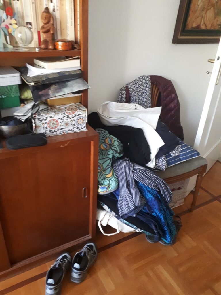Je me réveille, j’ai mal dormi, mon regard se tourne vers un empilement, un tas, un bric-à-brac de tissus dépareillés. Je décide de le photographier sans conviction, perspective d’une photo banale, sans intérêt, à mettre ordinairement au rebut photographique, pourtant je cadre vite et j’appuie sur le bouton. Rien d’arrangé, agencement dicté par le hasard de gestes ayant accompli une simple dépose de vêtements sur une chaise les jours précédents au retour de vacances. La photo révèle le coin de la bibliothèque et de la chaise où s’amoncellent des vêtements d’été et un plaid ; tissus de couleurs, de textures, de compositions différentes, coton, soie, lin. Deux robes s’écoulent vers le sol, amorties par la deuxième paire de chaussures, des nu-pieds bleu marine à peine visibles. La première paire de chaussures, des sneakers bleu et bleu-marine sont tournés vers la porte entrouverte prêts à partir. Noir et blanc unis, tissus bleus-marine et turquoise à fleurs, rayures bleues et blanches, alvéoles carrées bleues point central bleu, fond blanc, coussin rayé bleu et blanc, sur le dossier de la chaise ancienne une doudoune light brillante, rouge foncé. Parquet et bibliothèque, assise de la chaise en velours vert amande, au-dessous du siège une boîte en carton. Plis pantalon blanc en ailes d’oiseau. La bibliothèque et le côté de la chaise maintiennent un plaid très coloré, dessins de Frida Kahlo. Deux yeux fixes qui tout à coup semblent s’emparer du désordre et lui donner une vie singulière. Au sol un sac en tissu blanc cassé muni d’une anse dirigée vers le bas. Sur les étagères de la bibliothèque un petit bouddha, une boîte indienne, une boule de verre, des livres, des pochettes, un bol tibétain, porte ouverte. Une araignée qui surgit puis disparaît, la photo n’a pu la capter, un monde invisible silencieux s’exprime. Bientôt tout se retrouvera par terre, étalé, froissé et buvant la poussière. Sur le côté, l’angle gauche du tableau d’un ami disparu.