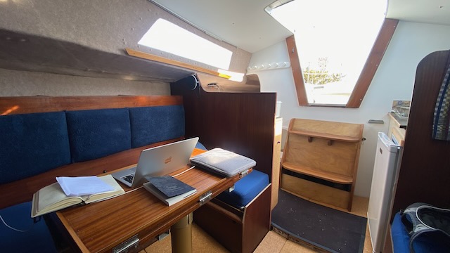 Une cabine de bateau quand le bateau est petit c’est toutes les pièces en une, le bureau, la cuisine, la chambre, le salon et sa bibliothèque, aussi le coin repas et même les toilettes quand tu poses ton seau (le bleu, pas le rouge qui est pour la vaisselle) au milieu du plancher. Dormir dans le canapé, manger comme les romains, à moitié allongée histoire de jeter un œil sur la carte étalée et puis sur le compas.