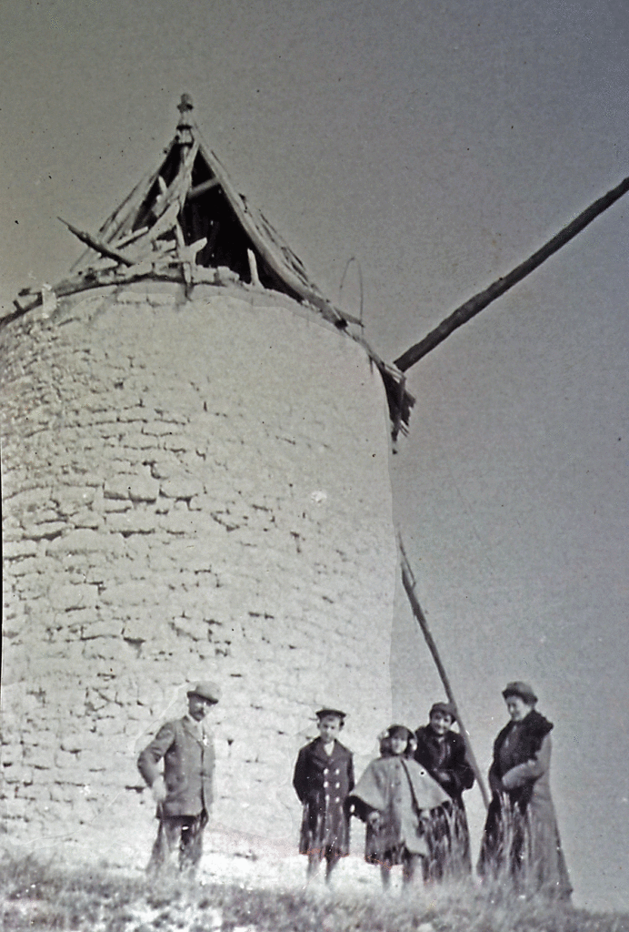 Pourrait-il s’agir de notre moulin à vent ? Le volume de ce moulin semble correspondre à celui du nôtre, mais il existe quantité de restes de moulins du même modèle à travers le pays. Ses pierres mal jointes lui donnent l’aspect d’une ruine, alors que celles du nôtre absolument solidaires les unes des autres semblent à l’épreuve des intempéries. Deux madriers subsistent : un en direction du ciel, un en direction du sol, vestiges des ailes. Le toit pointu, façon clocheton est crevé. Ce n’est pas de l’examen de l’édifice que me viendra la réponse, mais peut-être des personnages. Muni d’une loupe, je les examine : un homme, deux adolescents et deux femmes. Je commence un travail de comparaison avec les quelques photos de ma famille qui ont survécu au désastre du cambriolage. Et voici mes conclusions : l’homme est mon arrière-arrière-grand-père Auguste, le viticulteur qui fit la fortune de la famille, les deux adolescents sans doute ses fils Jules et Paul, le plus jeune, mon arrière-grand-père. Derrière les enfants, ce doit être leur mère, Marie. Je ne suis pas sûr de l’identité de la femme du premier plan, je penche pour une belle-sœur de Marie, le frère de Marie doit être l’auteur du cliché. Il faudra que je creuse davantage. Victoire ! Il s’agit bien de notre moulin et je peux dater la photo, car je connais l’année de naissance de mon arrière-grand-père (1891). Sur la photo il a une dizaine d’années. Ce cliché date du début du XXème siècle, entre 1900 et 1902. Donc, à cette date, le moulin avait toujours un reste d’ailes, il n’avait pas encore été transformé en pigeonnier pour collecter de la colombine peut-être, ou plus sûrement pour ne pas laisser un patrimoine en déshérence. Les travaux eurent donc lieu entre 1902 et 1915.