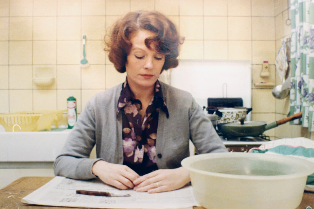 Ça m’a saisie en entrant dans la salle du musée du Jeu de paume, j’ai vu la faïence jaune pâle des murs de la cuisine de Jeanne Dielman, j’ai vu Delphine Seyrig, la bassine d’eau, les pommes de terre. Me revenaient les meubles, les motifs du papier peint, des rideaux et du fauteuil, les couleurs familières. Me revenaient les visages, de ma grand-mère, de ma tante, de ma mère. Les gestes encore. Le corps penché sur l’évier, sur la cuisinière, sur la table de la cuisine. Quand Jeanne boit un verre de lait, quand Jeanne dans la baignoire, quand Jeanne se maquille, quand la banalité belle, quand à peine la voix de Delphine Seyrig, quand toujours le corps, quand les détails, la lumière, tout me fait revenir à Corbera. Pauline se lève, mille fois se lève. Pour aller chercher encore une assiette, une cuillère. Pour couper, servir, remplir, ramasser. Elle se déplace comme une force invisible qui tient tout debout, sans jamais s’asseoir vraiment. Elle découpe les frappes. Un geste sûr, qui a l’élégance d’un rite. Un geste simple qui fait exister tout un monde. Il faudrait écrire les gestes minuscules. Les gestes répétés, obstinés. C’est peut-être ça, la mémoire, le mouvement obstiné de Pauline dans la cuisine. Et d’Annie. Et de ma mère. La mémoire ce sont leurs gestes qui se chevauchent, se répondent, se répètent.