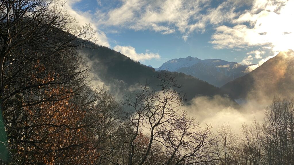 Des branches nues et noires. Des arbres d’hiver, sans feuilles, sans fleurs et sans fruits brouillent le bas de la vue en étendant leurs doigts. Branches traçant des contrastes, épaississant les traits, les esquissant finement, dans un grand brouhaha emmêlant les messages de la lecture d’ensemble. Chacun son écriture, couleurs d’encres différentes, tout en traits saccadés, ou lettres plus arrondies, rebondies dans leurs courbes, ou droites reliées d’angles. Calligraphie des arbres. Le pommier typographe a encore quelques fruits de l’été précèdent pour les mettre sur ses i. Derrière les traits noirs, les nuages blancs en fond secondent la lecture en amenant du contraste. Subtilité des tons, des histoires racontées entre noyers et frênes, de la cime des sapins jusqu’aux crêtes des montagnes. Les points et les accents s’envolent en sifflotant, tout en becs et en plumes, un chant mélodieux, récital amoureux. On distingue un point vif, ventre et capuchon rouge du batteur pic épeiche tambourinant la fin de chaque mesure sifflée par la mésange bleue. Orchestre volatile. Le ciel est un drap clair, juste quelques nuages qui s’étirent et libèrent les lits creux des vallées. Une violente lumière au passage du soleil par-dessus les sommets brûle toute la scène d’un blanc assourdissant